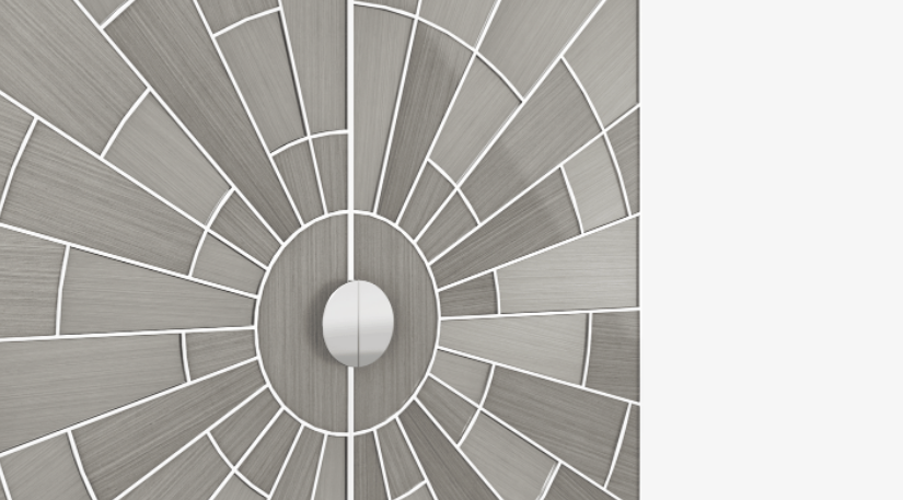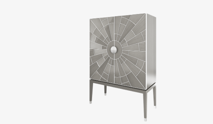 For a showstopping piece of storage, look to the CASABLANCA tall cabinet. Crafted from glossy wood veneer, a pattern of polished stainless-steel bursts across the surface like the sun's rays. The interior is organised with a leather-fronted, suede-lined drawer and embellished with a gris mirror back.