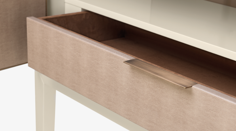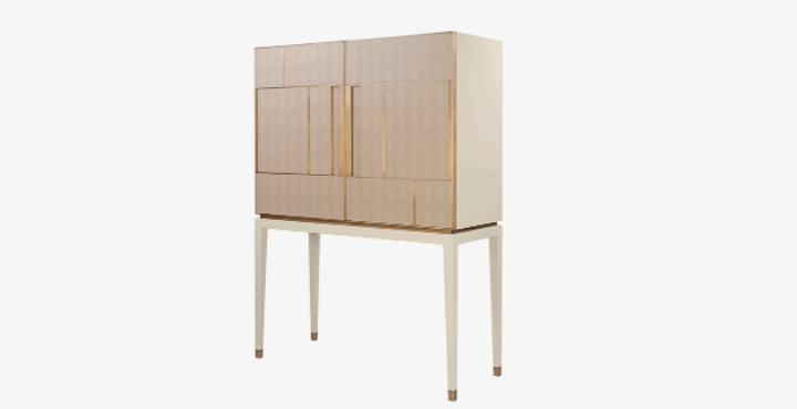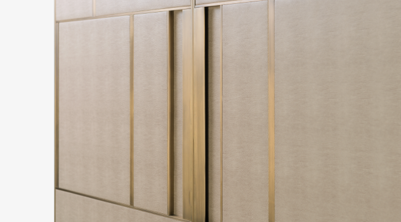 A chic way to add a geometric sensibility to your space, the DIDOT tall cabinet's double doors feature brushed brass inlaid with luxurious panels of faux-animal skin. Inside a suede-lined drawer provides compartmental storage while a bronze mirror back adds glamour.