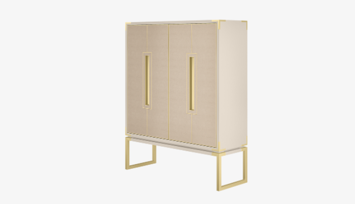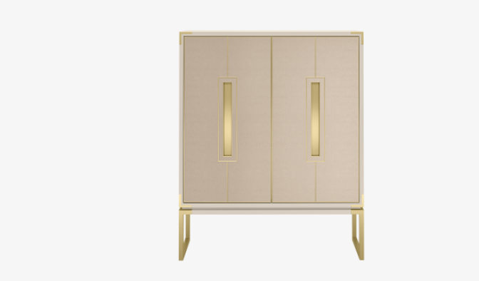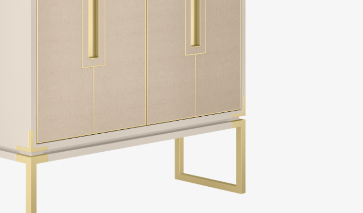Part of a three-piece collection, the GARDNER cabinet showcases the beauty of clean lines and neat angles. Formed from silky lacquer, its double doors feature luxe leather inlay and recessed handles highlighted by accents of brushed brass. Inside are suede-lined drawers and a clear mirror back.