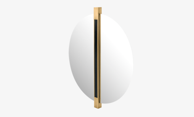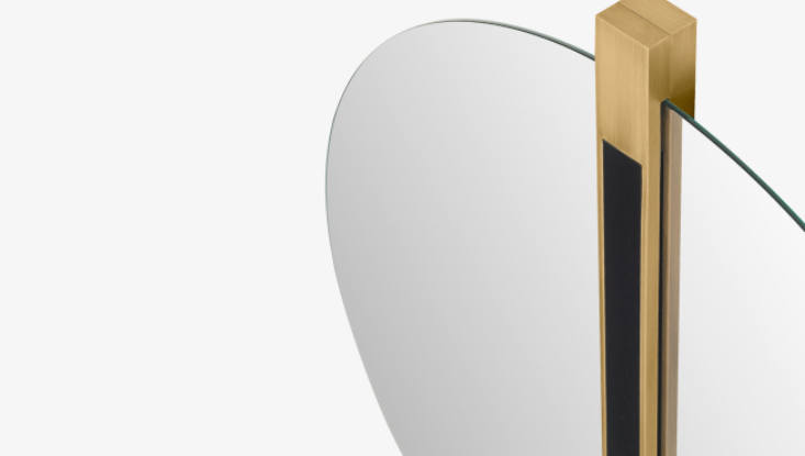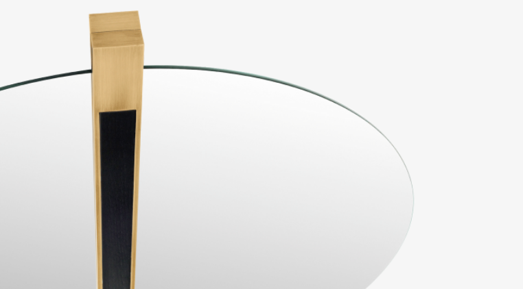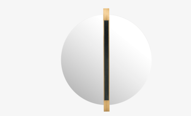 Imbued with an effortless simplicity typical of Japanese design, the OSAKA mirror uses subtle materiality to stunning effect. The slender mirrored disc is suspended within a beam of brushed brass inlaid with rich, dark wood veneer for a striking linear appearance.