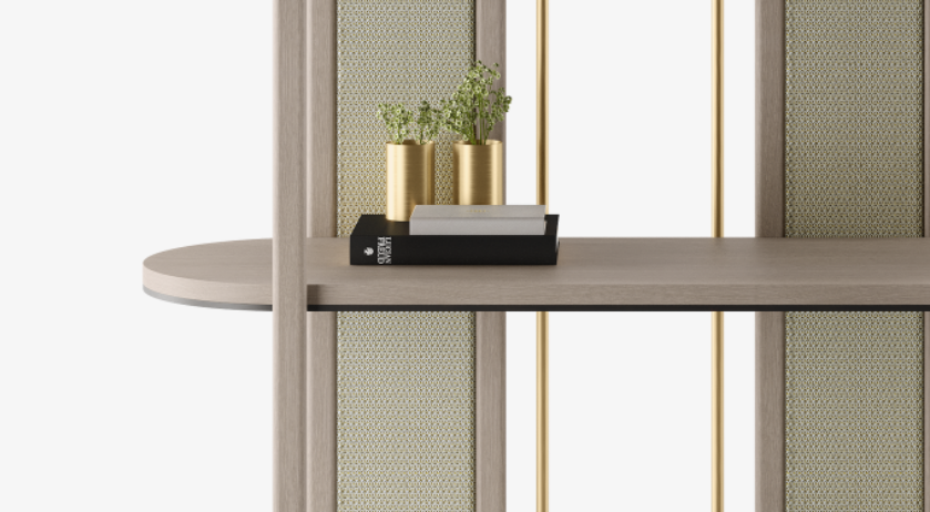 Made from wood and featuring a stone base, the freestanding FIRENZE bookshelf can be positioned against a wall or used as an elegant room divider. The generous shelf heights allow for the display of a variety of objects, while the back panels are inlaid with wallpaper, showcasing one of the innovative ways in which FRATO uses different materials.