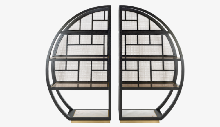 The shelves of the Orientally-influenced NARA bookcase are inlaid with bronze mirror, which gently reflects any object placed on top. This bookcase consisting of two perfectly symmetrical halves can be placed together as one or positioned apart.