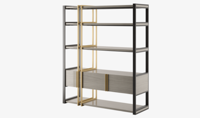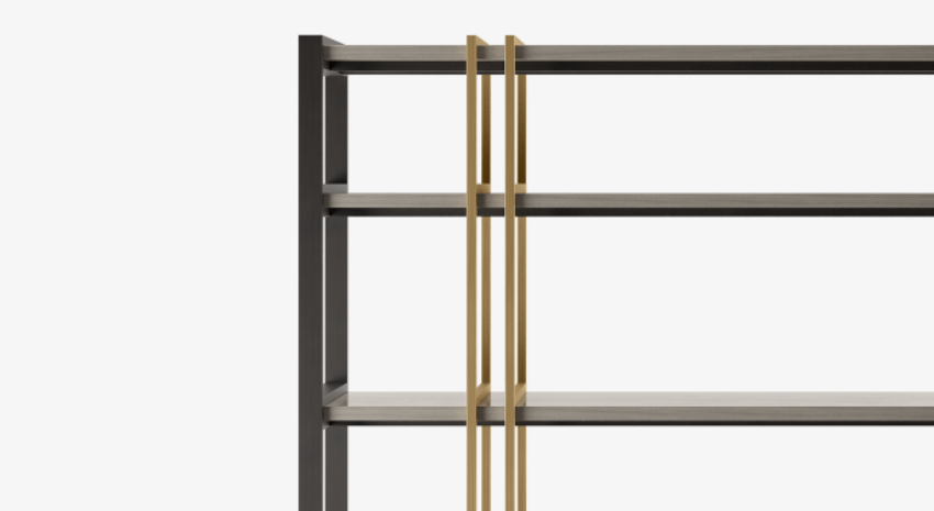 "Like a work of sculpture, the ODESSA possesses an abstract beauty. A blend of contrasting woods interrupted by a geometrical structure of brushed brass, it incorporates open shelves and a clandestine row of cupboards. "