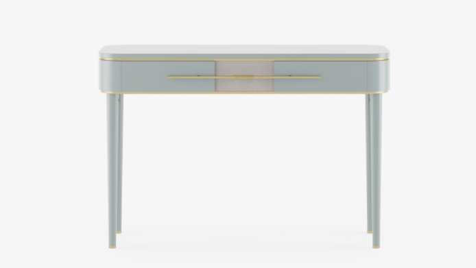 Powder blue lacquered wood distinguishes the delightful AGRA dresser, which features brushed and knurled brass details and a single, elongated drawer with leather inlay. Additionally, slender, tapered allow for a chair or stool to slot beneath.