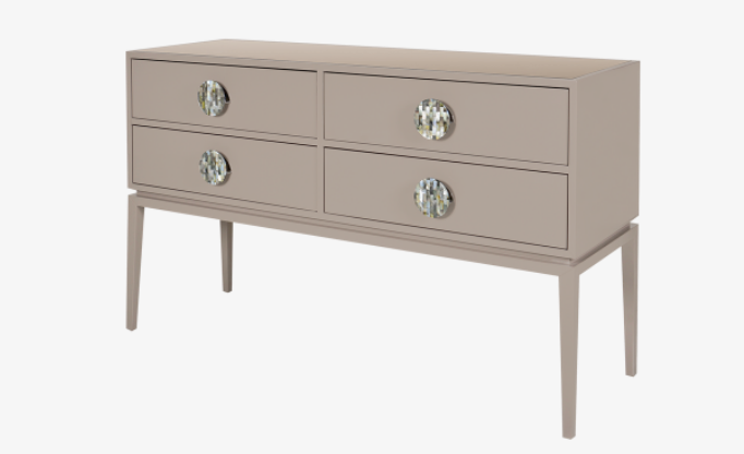Elevate your beauty routine with the four-drawer GEORGIA dresser, which puts a fresh spin on a classic silhouette with contemporary materials including a glossy lacquer structure and bronze mirror surface inlay. Black mother-of-pearl handles add the finishing touch.