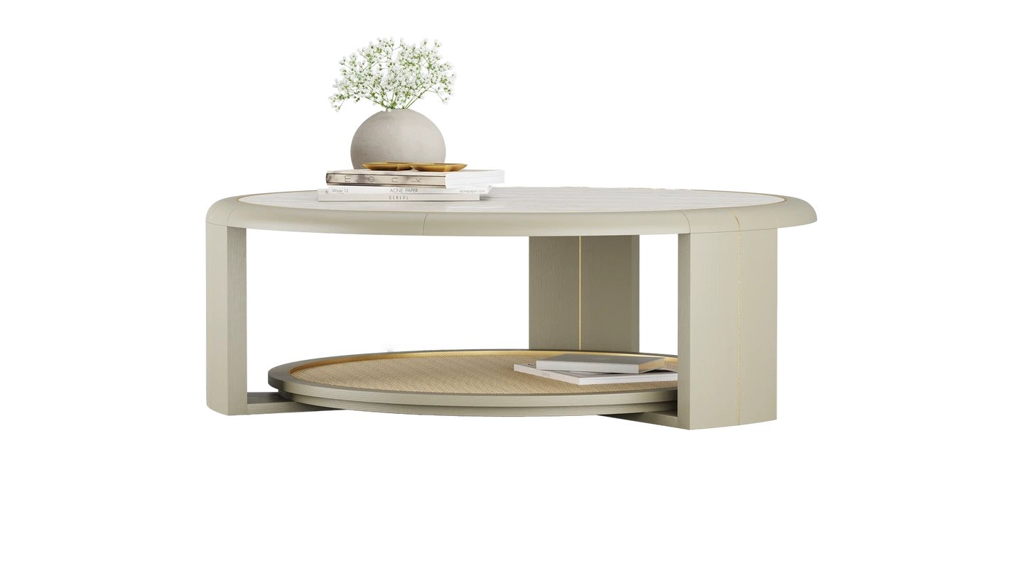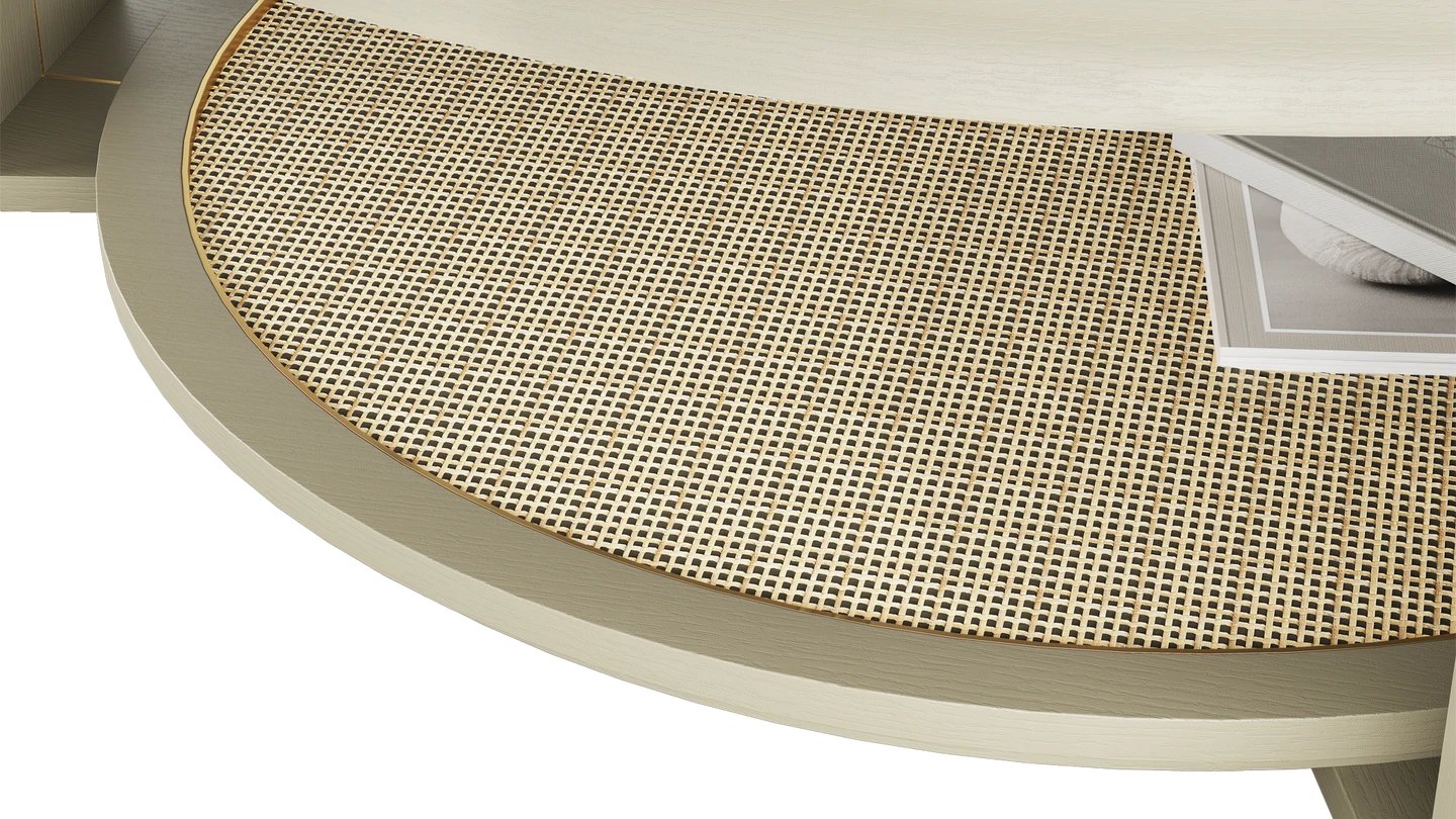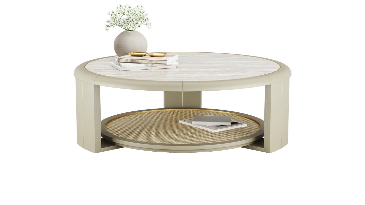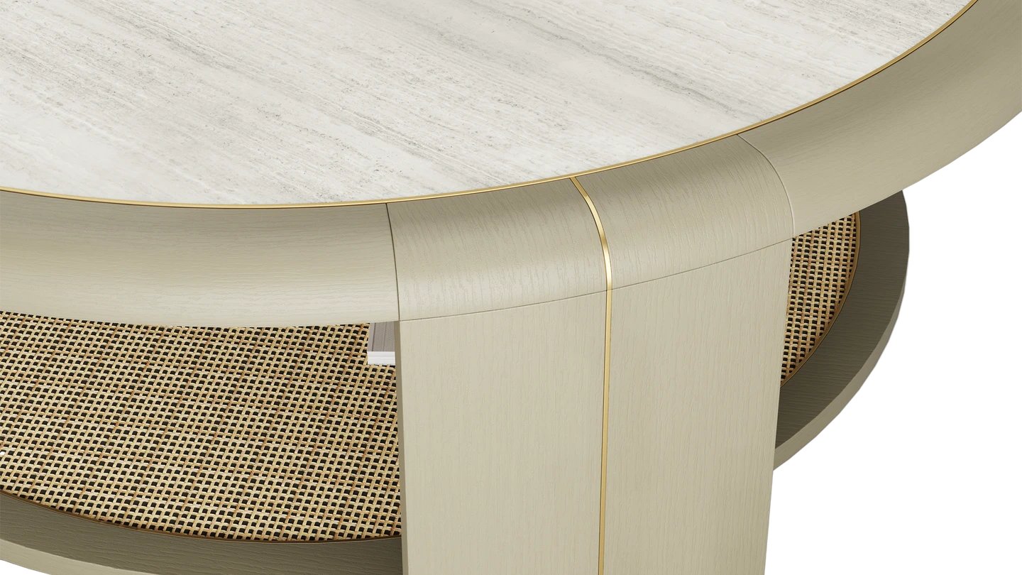 "The SORRENTO Coffee Table brings a laidback feel to your lounge. Stone sits atop rattan, combining elements to bring the outdoors in. Meanwhile, brushed brass adds elegance. "
