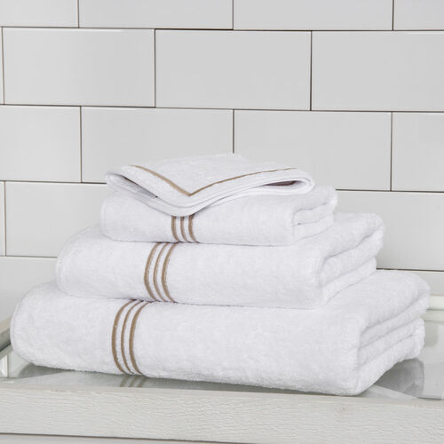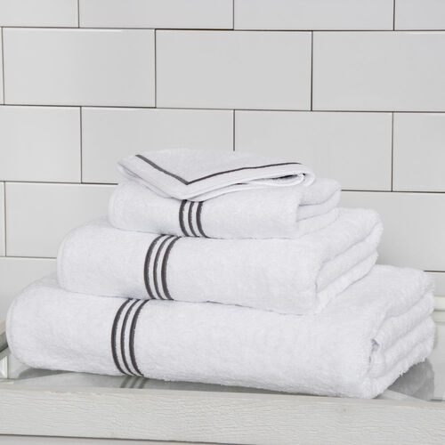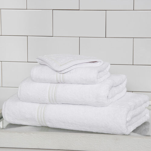 A super soft and plush cotton terry bath towel featuring a three-line embroidery finished with a cotton sateen border. Style with the coordinating bath sheet, hand towel, and wash cloth. 100% cotton. Made in Italy.
