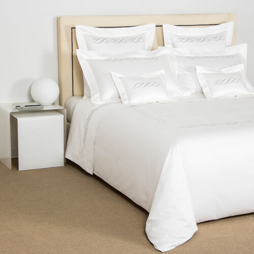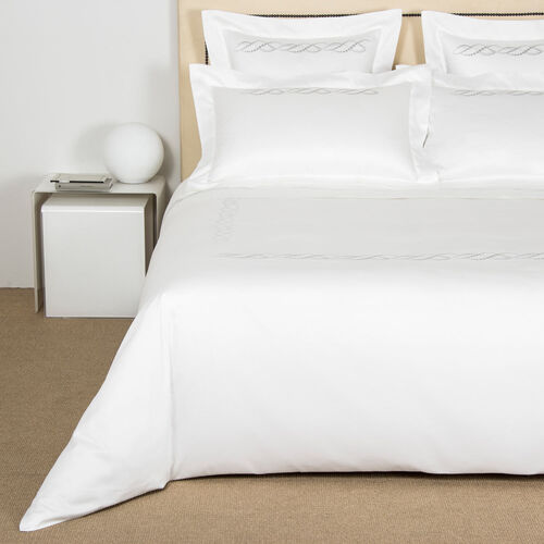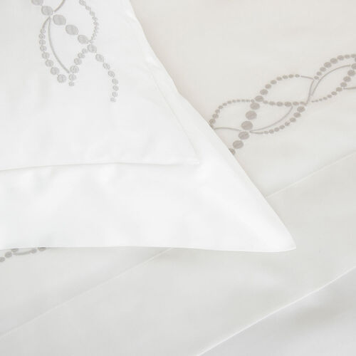 The Pearls Embroidered duvet cover features a stylish design consisting of dotted lines that intertwine in a helical pattern. The dots in the pattern are of varying sizes, bringing to mind the elegance and beauty of fine pearl jewellery. The duvet includes four lines of this delicate embroidery, arranged in a square in the centre of the cover, bringing a feeling of peace, harmony, and refinement to your bedroom. Pure extra long staple cotton. Made in Italy.