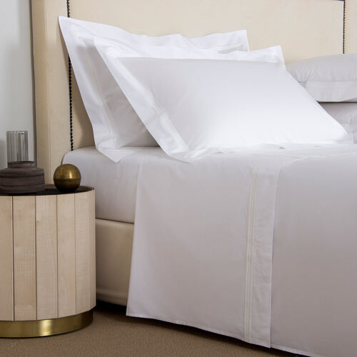 The Triplo Bourdon Sheet Set is crafted from smooth cotton poplin and has a remarkable sheen and brightness and finished with a three-line embroidery. This sheet set includes a top sheet, a fitted bottom sheet, and two shams. 100% cotton. Made in Italy.