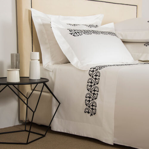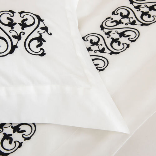 The Ornate Medallion Embroidered Sheet Set features silky smooth long-staple cotton sateen. Its elegant embroidery effortlessly blends in with every bedroom interior. Transform your nightly routine into a luxurious escape with this silky smooth fitted sheet. This sheet set includes a top sheet, a fitted bottom sheet, and two shams. 100% cotton. Made in Italy.