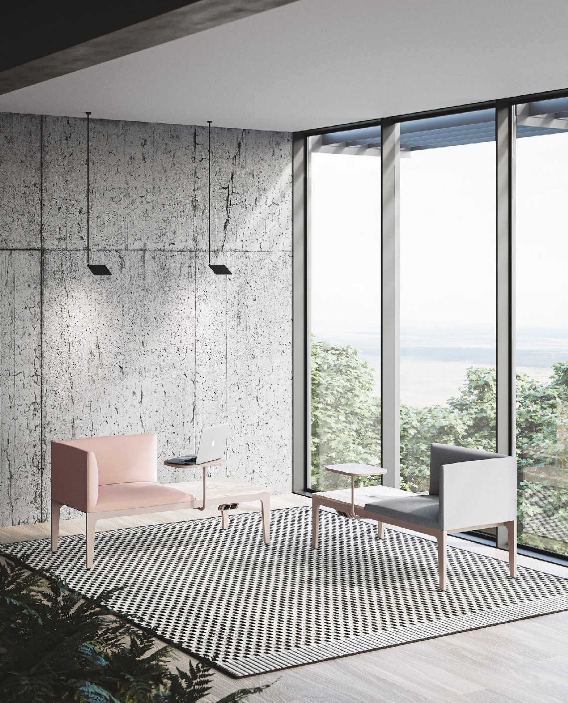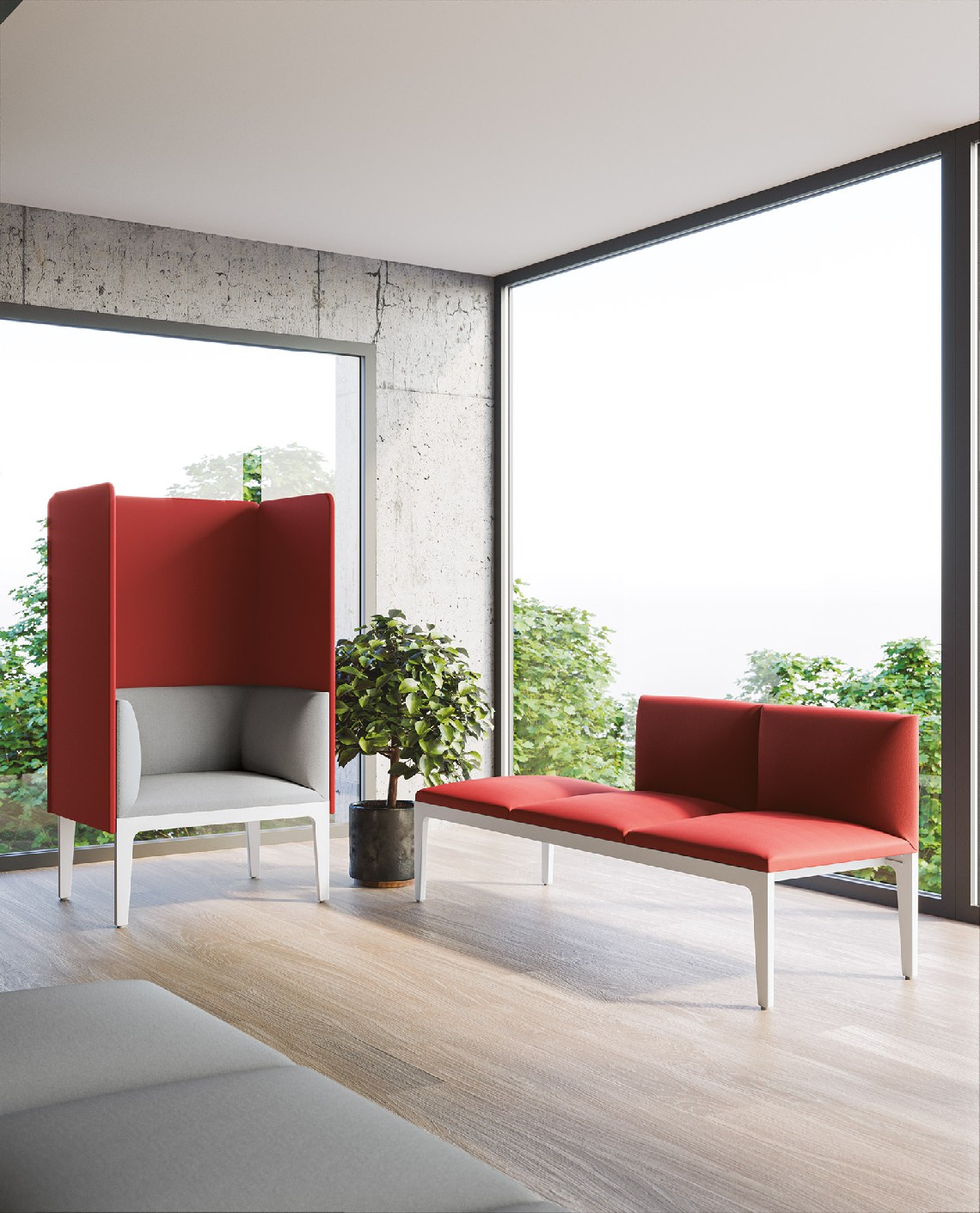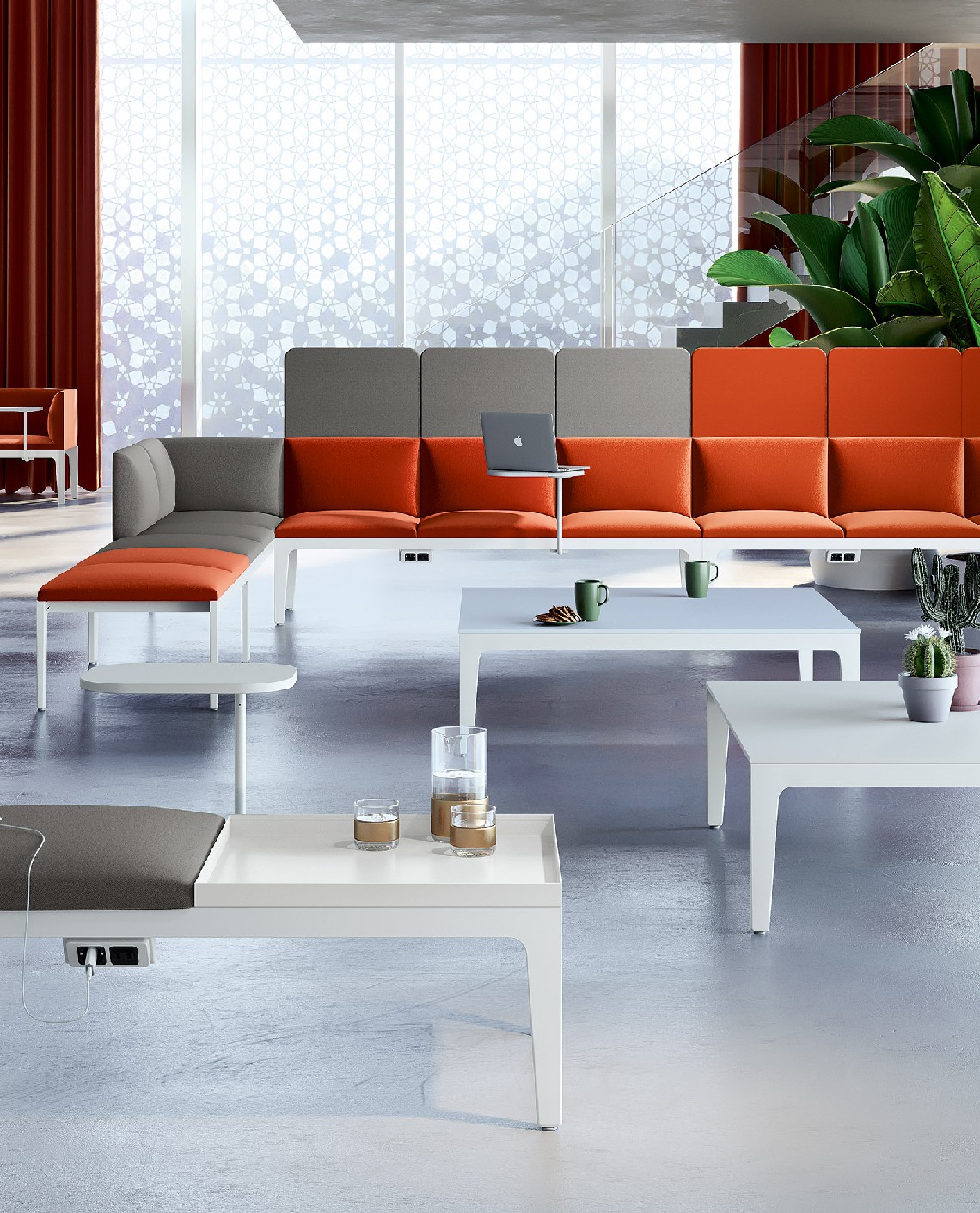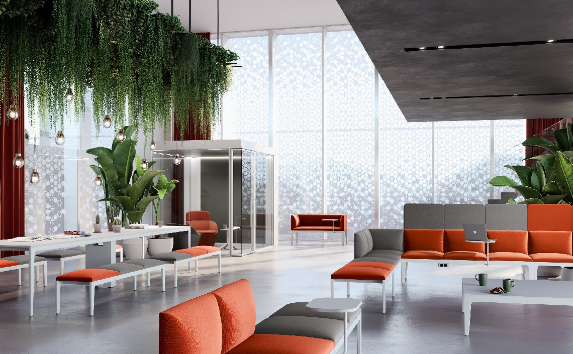 Alle tradizionali postazioni di lavoro, la flessibilità di panche, poltrone e divani Alplus crea una proposta di arredo unica ed omogenea.