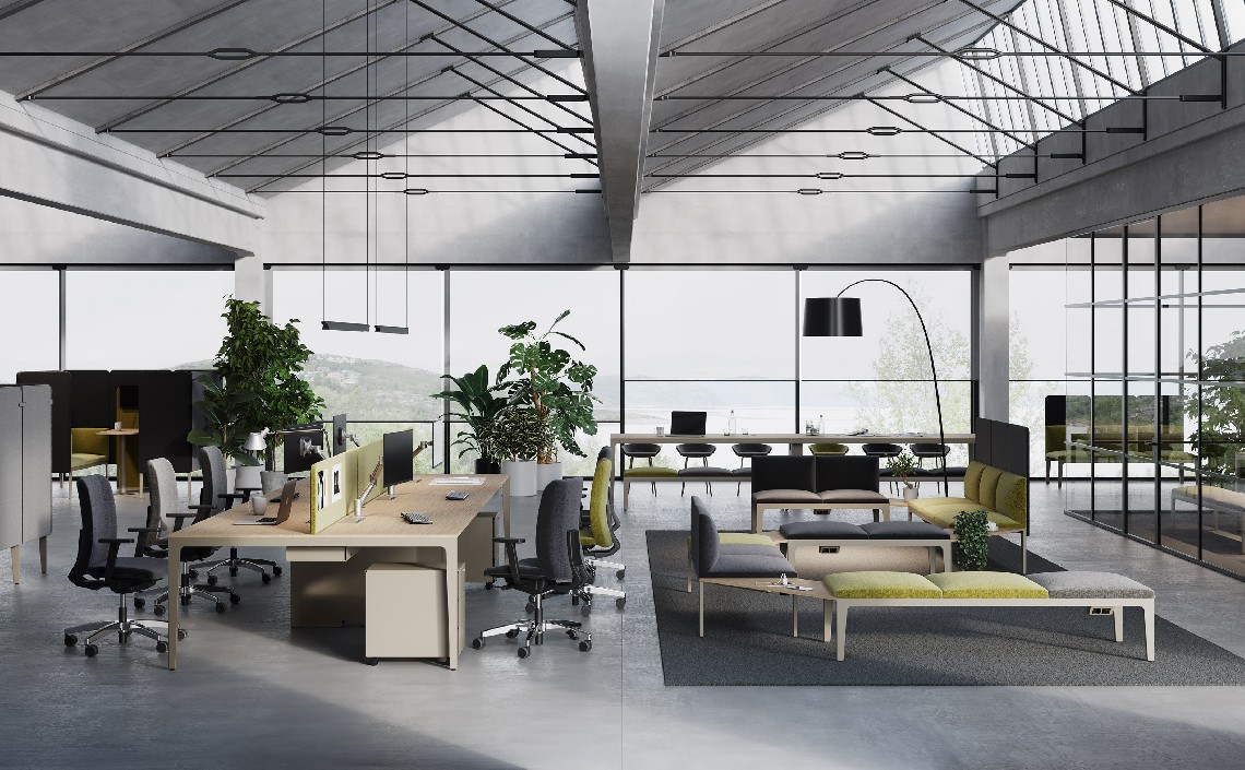 La forte commistione tra ambienti relax e spazi in cui è richiesta un’intensa concentrazione, viene supportata dal sistema d’arredo per ufficio Alplus: adatto ad ogni area di lavoro, dialogando con lo stesso linguaggio estetico, crea un ambiente esclusivo.