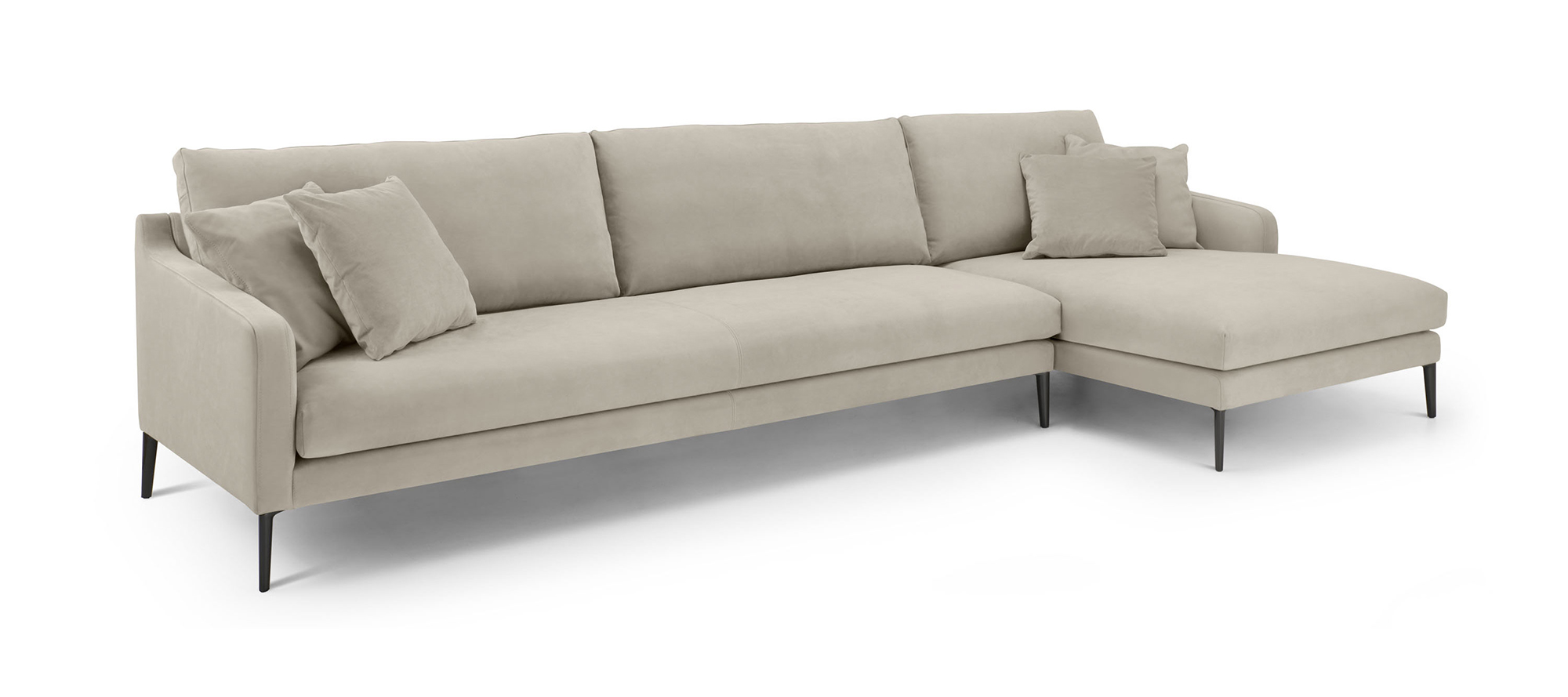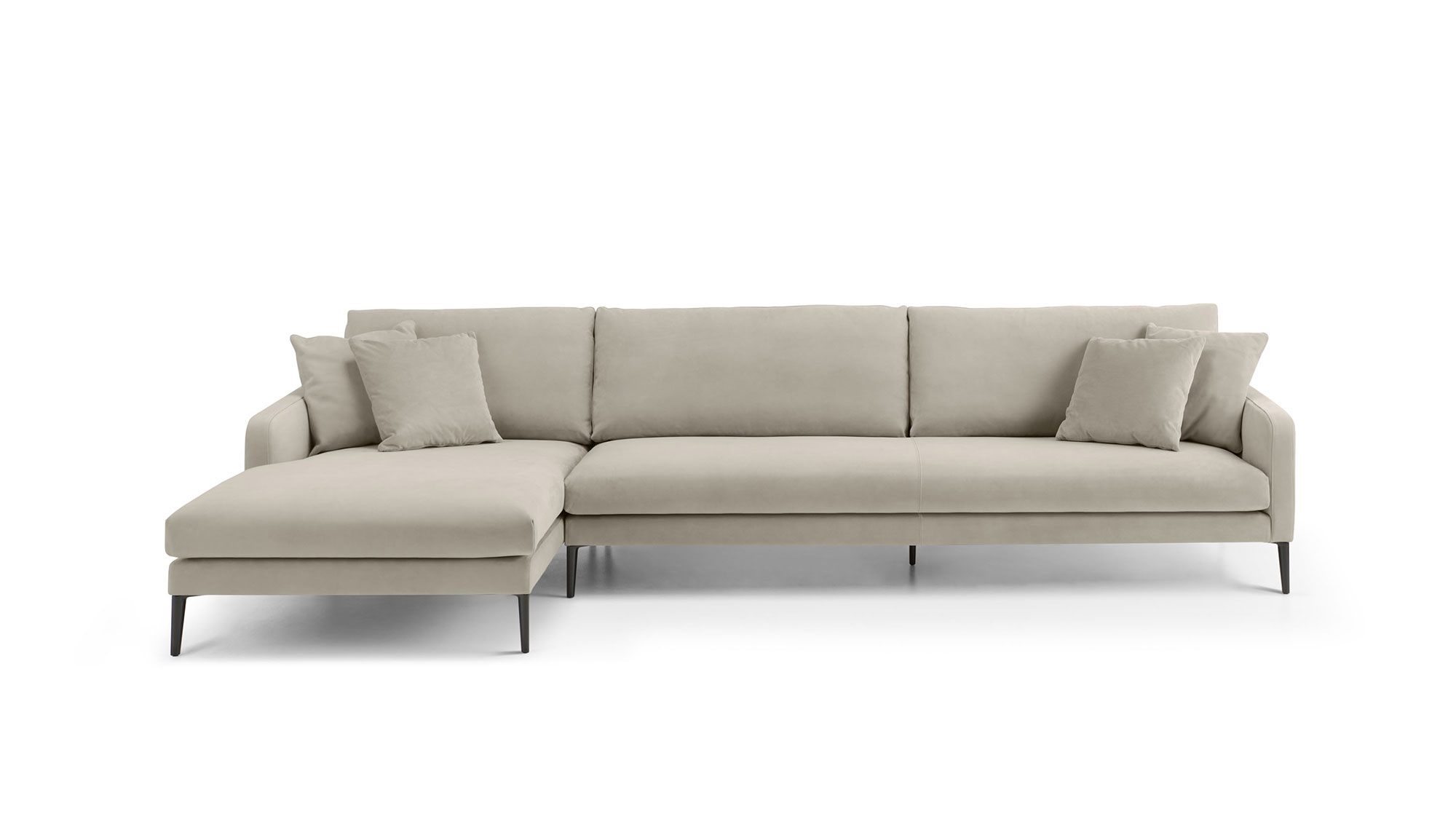 Divano fisso o componibile con struttura interna in legno multistrato. Molleggio seduta con cinghie elastiche. Imbottitura dei cuscini seduta in poliuretano a densità variabile; imbottitura dei cuscini schienale in piuma d’oca lavata e sterilizzata.