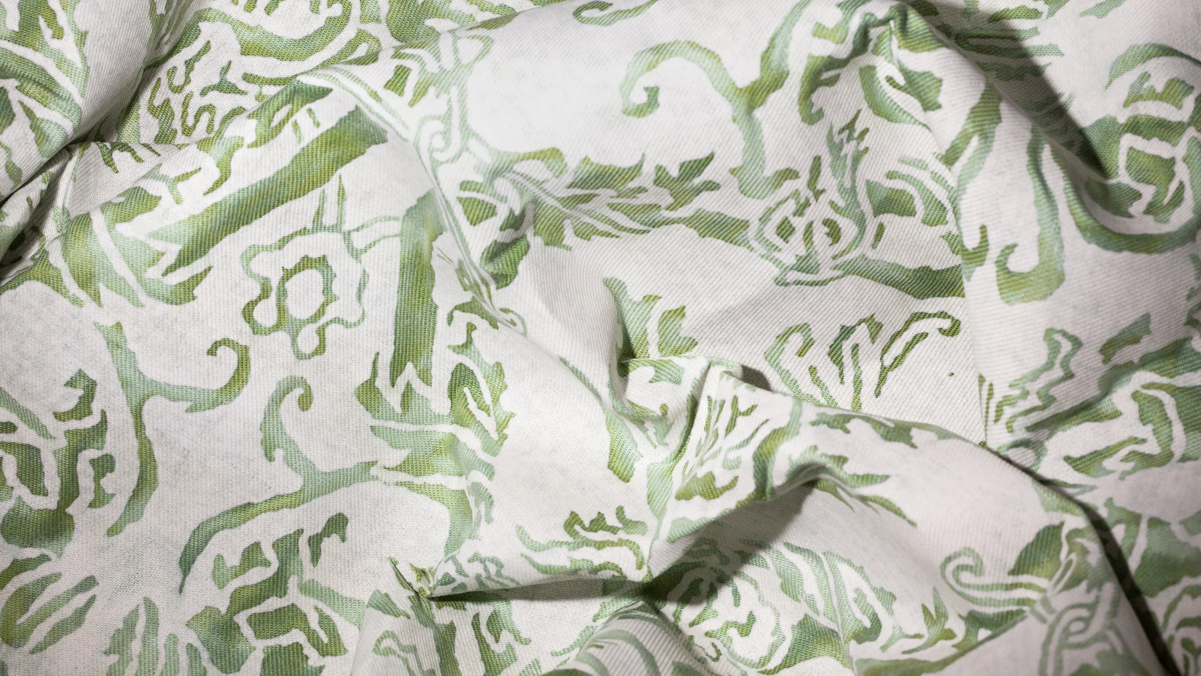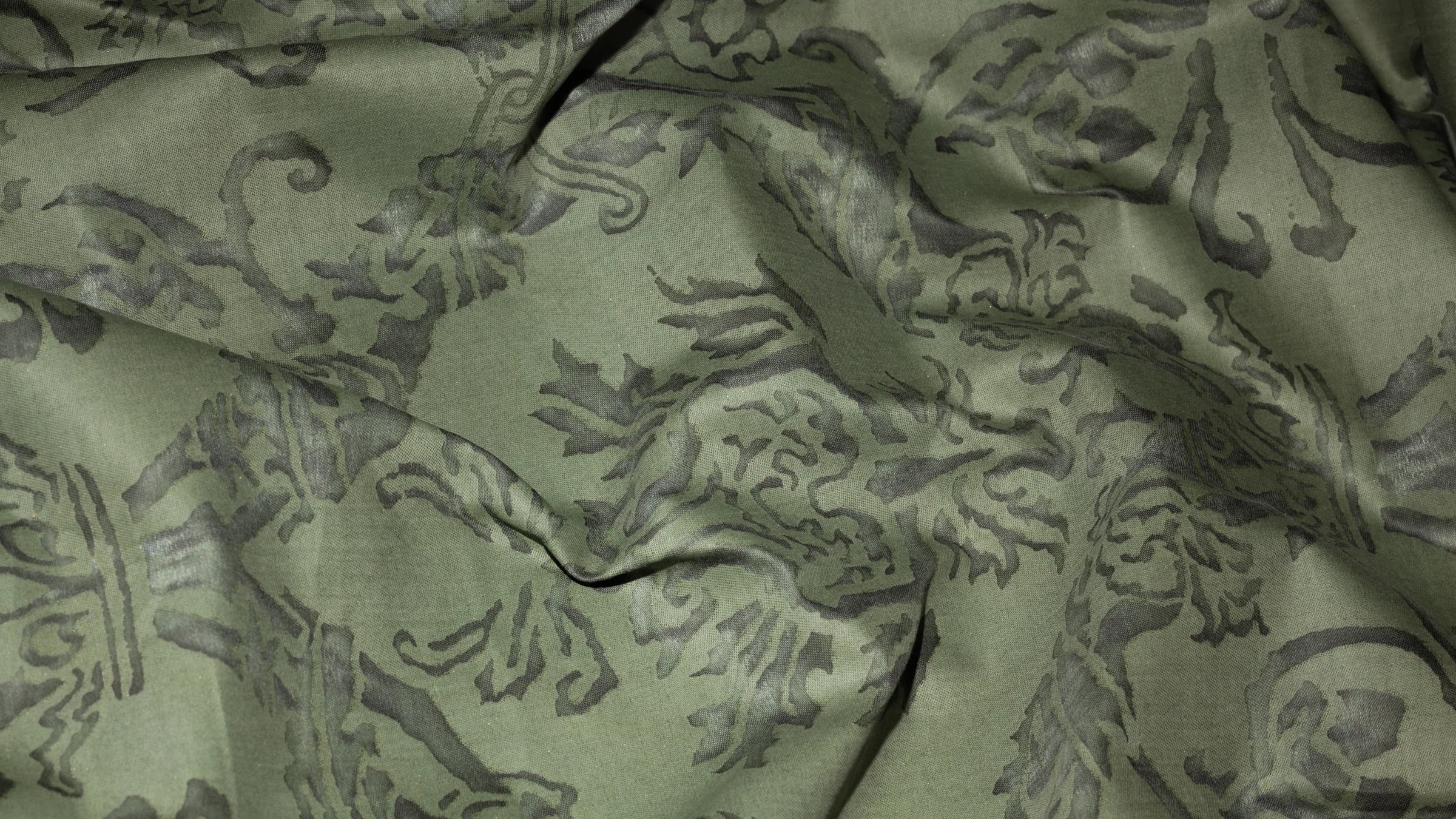 Like an intricately designed gate, SPAGNOLO winds across the field, tangled in vines and leafy tendrils while supporting a lush, seemingly mid-bloom pomegranate motif. The 17th-century Spanish design, created early in Mariano Fortuny’s career, pays tribute to his motherland and the city of his birth, Granada, Spanish for pomegranate.