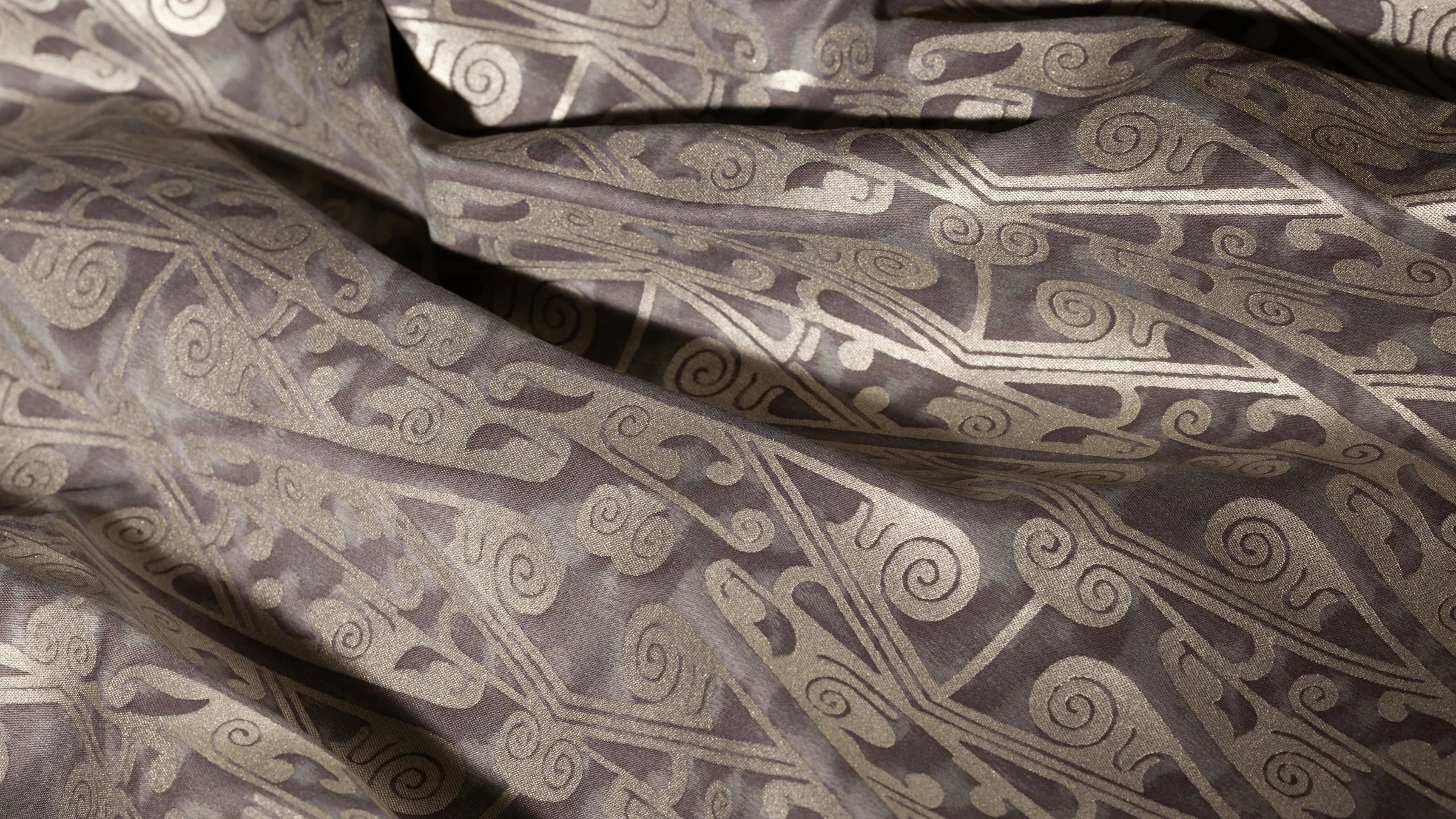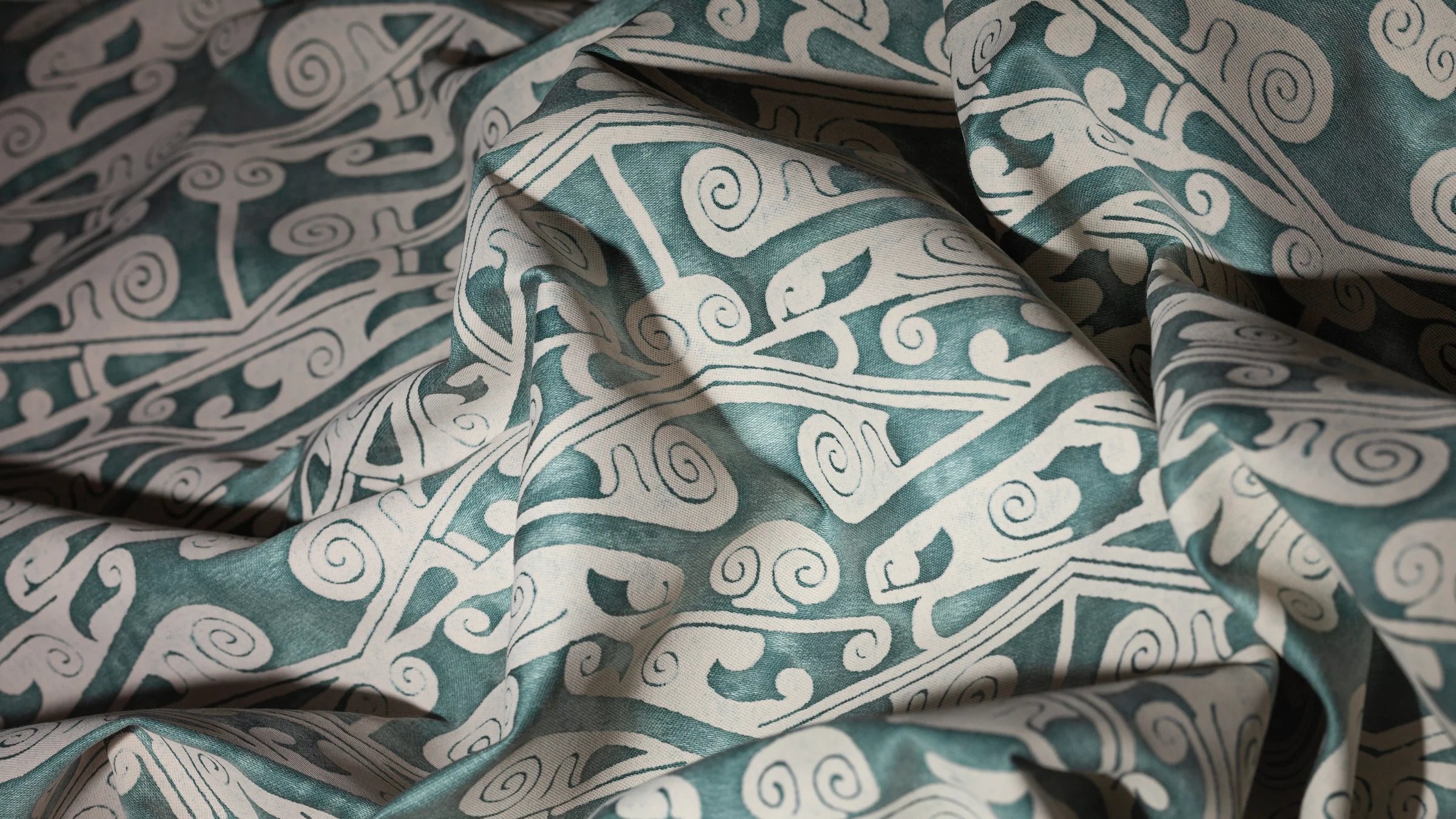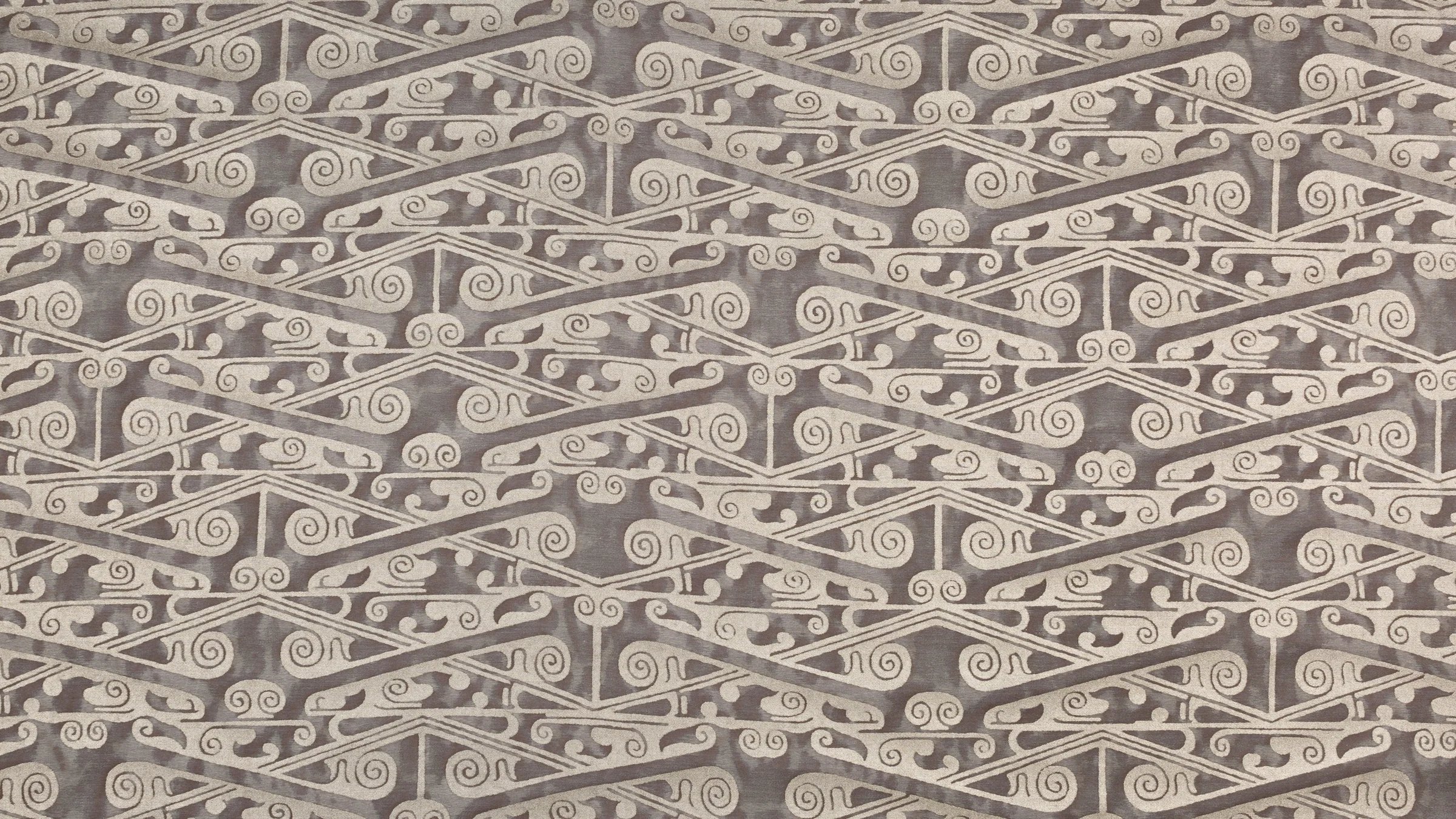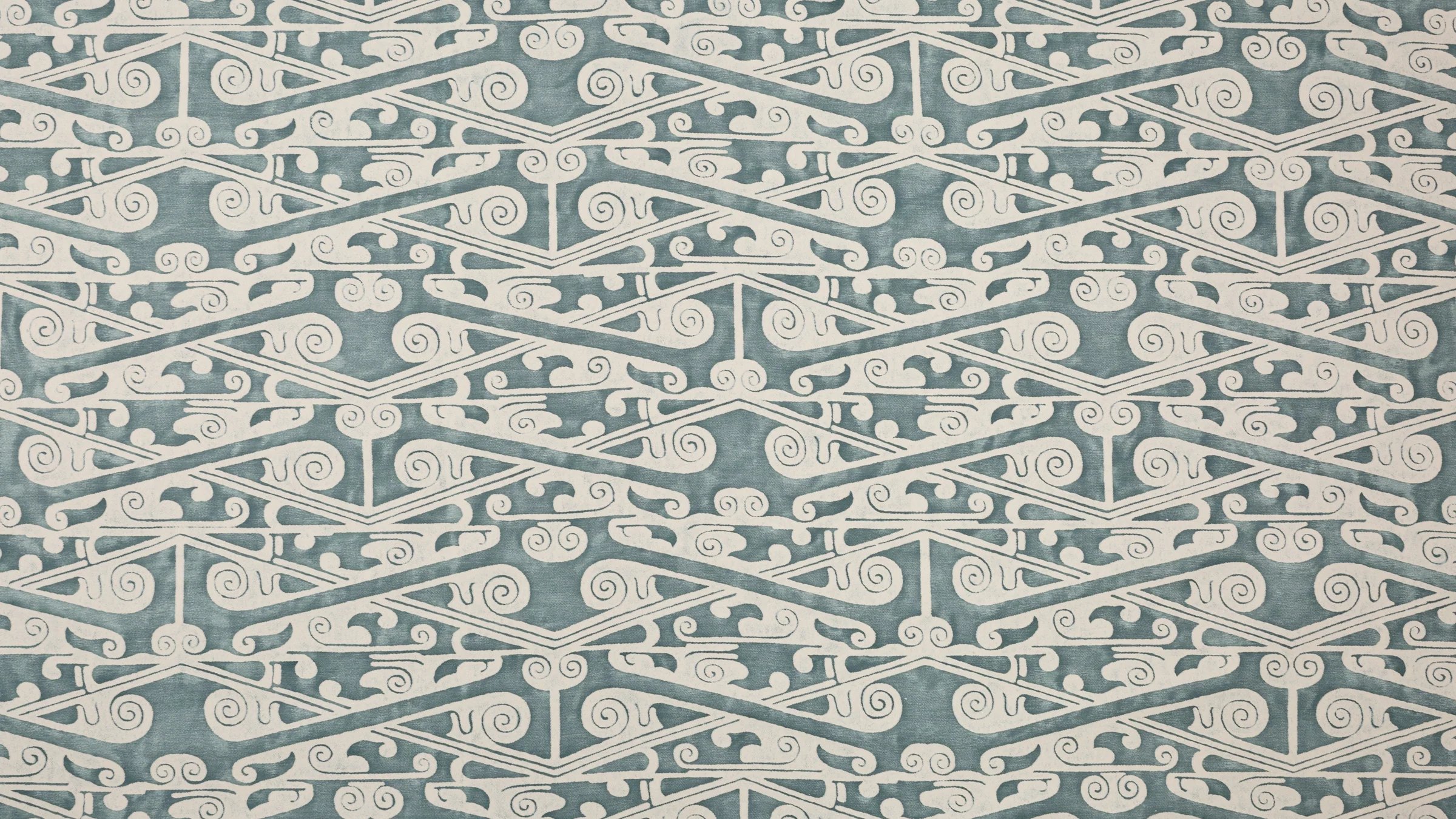 Designed in 1949, just months before Mariano Fortuny’s passing, TZIN’s pattern remains a bit of a mystery. However, the name and spiral motif suggest the Mesoamerican city of Tzintzuntzan, first excavated in the 1930s and 40s. The site's five rounded yácata pyramids were arranged in a keyhole-like shape and clad in stone slabs decorated with spirals, circles, and other petroglyphs, similar to the motifs in TZIN.