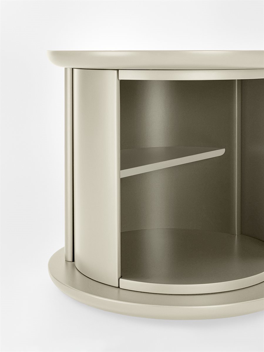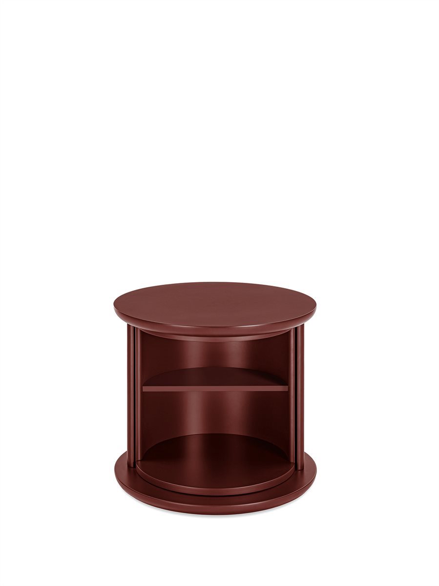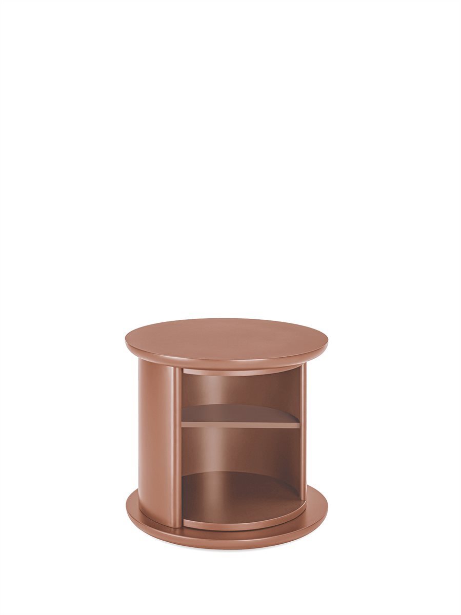 Tavolino con struttura, cilindro girevole e ripiano in legno laccato lucido o opaco. Colori disponibili: “Rosso Persia”, “Grigio Londra”, “Nero Giza”, "Bianco Camargue", "Verde Provenza", "Blu Pacifico", "Bordeaux Etruria", "Rosa Jaipur" e "Sabbia del Nilo".