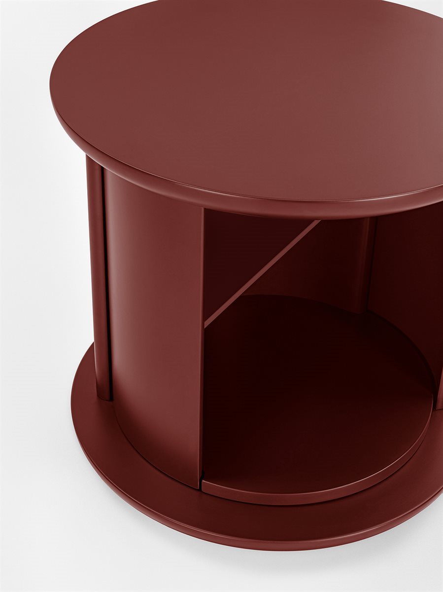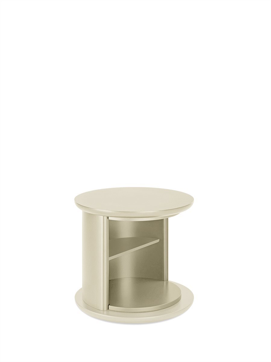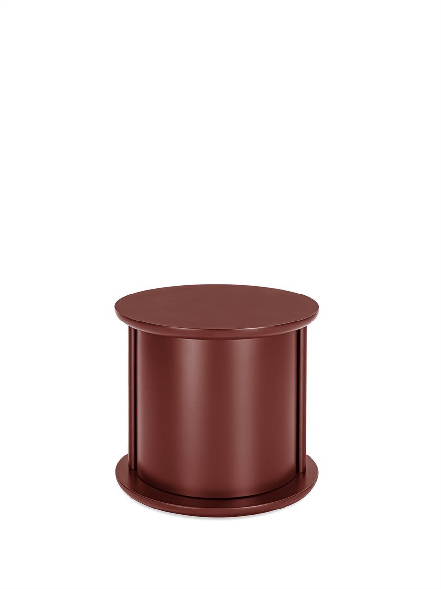 Tavolino con struttura, cilindro girevole e ripiano in legno laccato lucido o opaco. Colori disponibili: “Rosso Persia”, “Grigio Londra”, “Nero Giza”, "Bianco Camargue", "Verde Provenza", "Blu Pacifico", "Bordeaux Etruria", "Rosa Jaipur" e "Sabbia del Nilo".