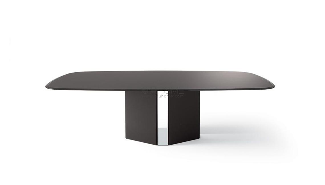 Table with 15mm painted glass top as per samples in the bright or satin version. Glass top with 3cm bevelled edge. Wooden base covered by painted glass. “Supermirror” bright stainless steel metal parts.