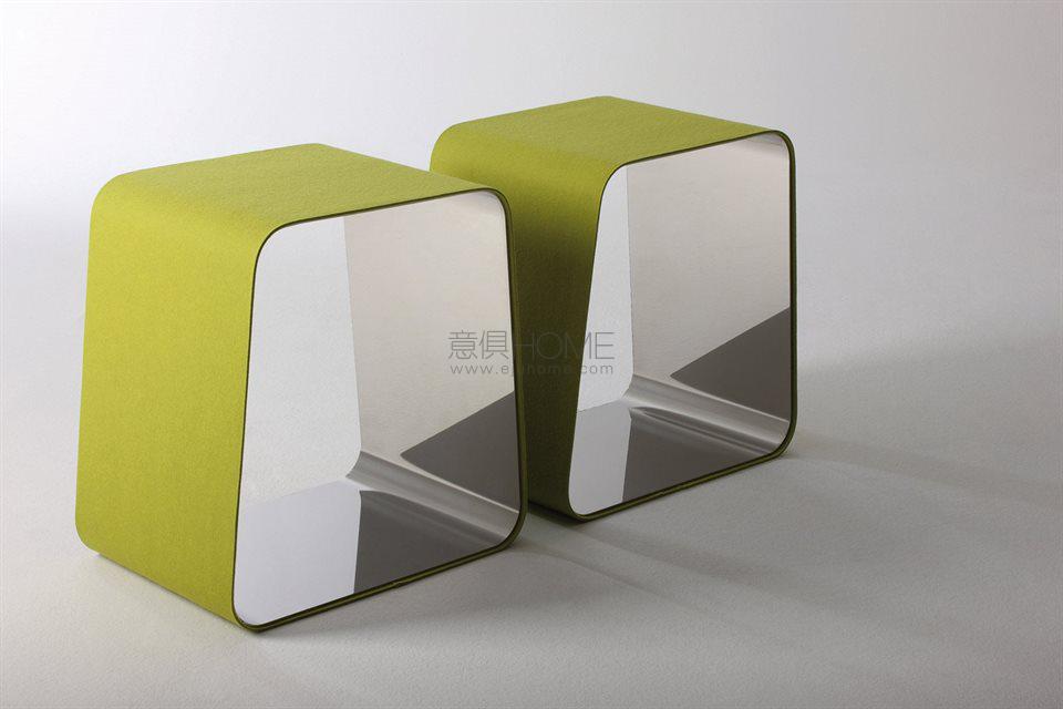 Bright stainless steel or embossed white, grey aluminium or satin brass colour lacquered metal stool, covered by felt, leather, suede, outdoor fabric (Corbezzolo) or velvet as per samples.