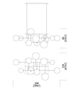 Hanging lamp with dimmable LED light (G4 2700 Kelvin). 10 (A) or 16 (B) transparent blown glass spheres. Metal parts in hand burnished brass. The hand burnished brass finish looks naturally spotted and irregular. Dimmable light. Supplied with cable 4mt long.