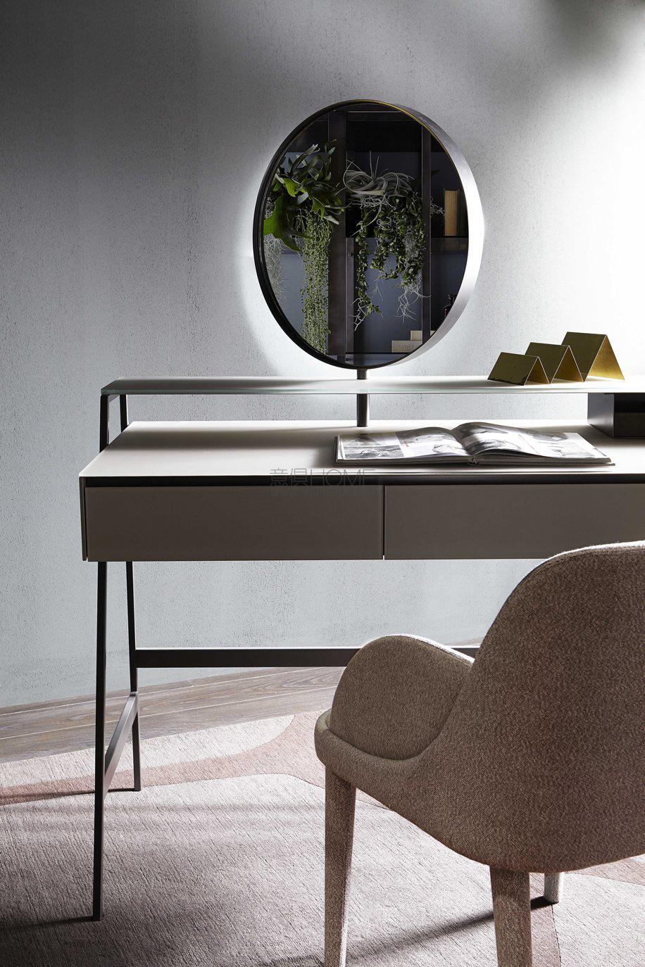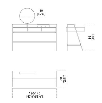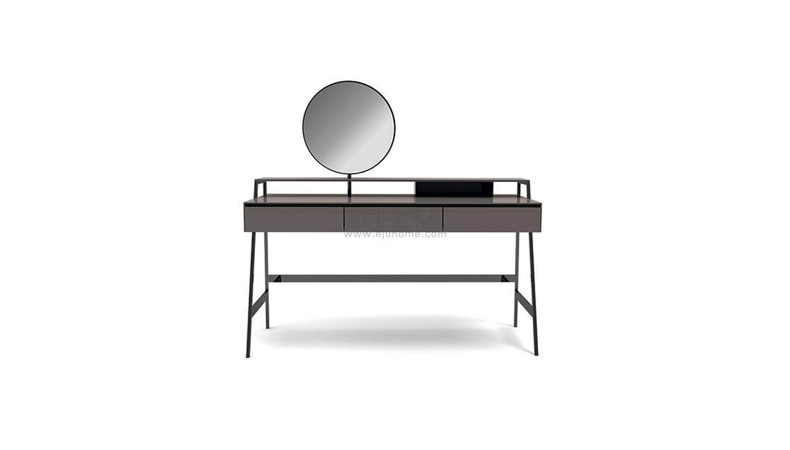 Vanity wooden desk covered by painted glass, as per samples in the bright or satin version. Rotating double face mirror ? 50cm. Magnifying mirrored insert on request. Chestnut with “fabric” touch effect lacquered drawers. Burnished metal structure. Small boxes in metal covered by suede Sand 012.