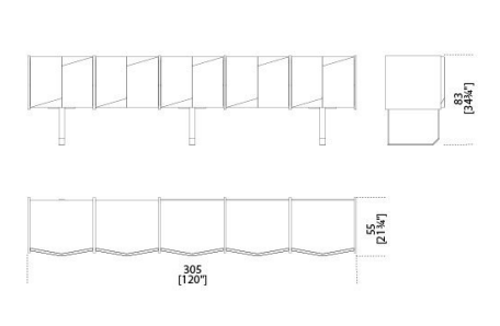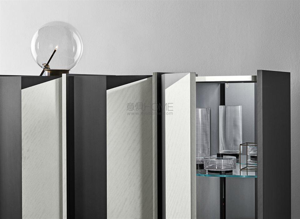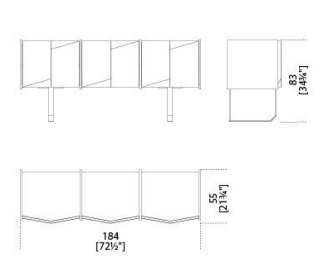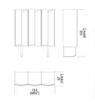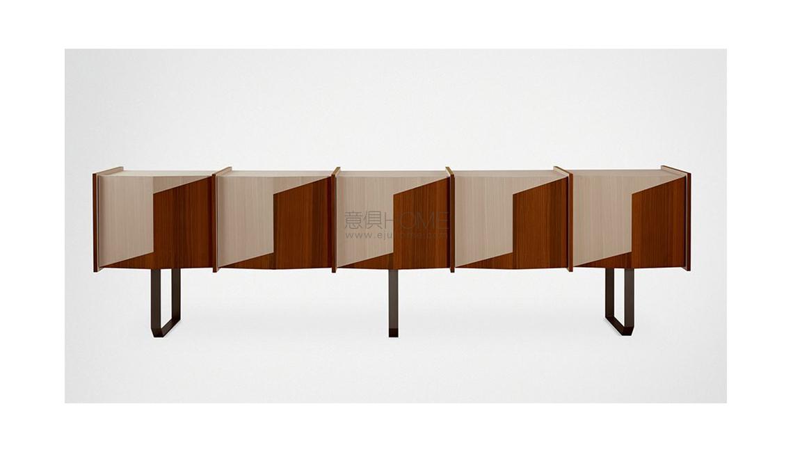 Sideboard in Taba Frisé white wood and Tanganika black wood with satin brass lacquered metal structure. Available also in ash and rosewood with black bronzed metal structure or in inlaid wood with “Tweed” pattern with black lacquered metal structure. Supplied with 8mm tempered extralight glass shelf and mirrored inside glass back.