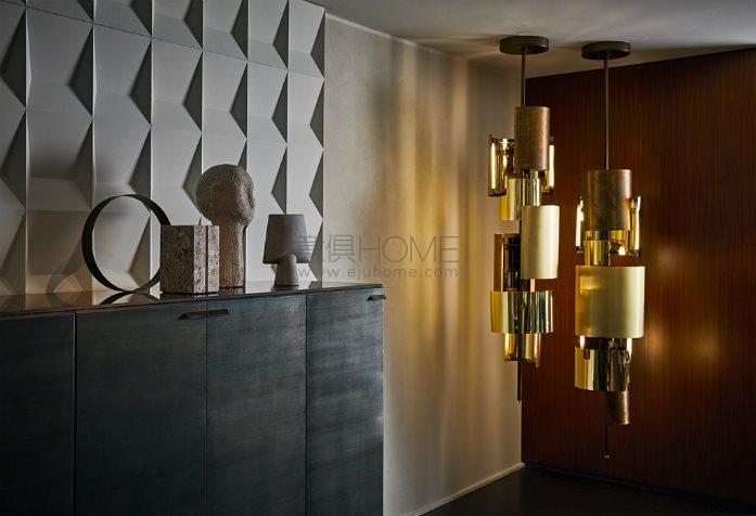 Hanging lamp with LED light with black bronzed painted structure and bright, satin, hand-burnished brass and black chrome parts.
