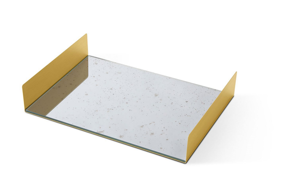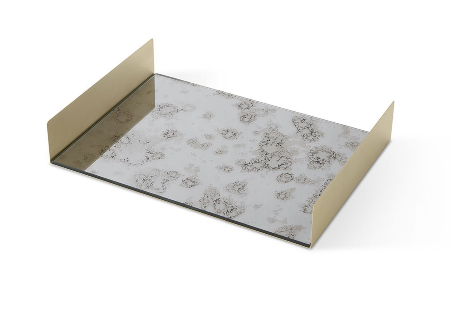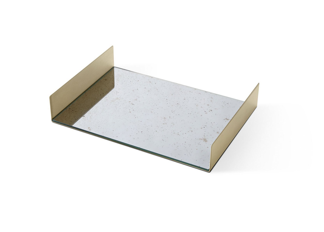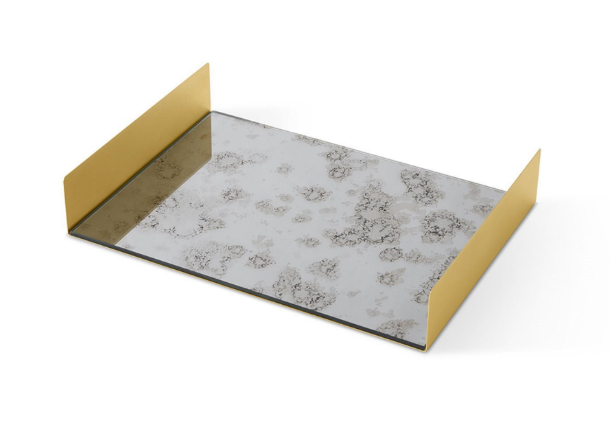 Tray in satinated brass and antiqued mirror or decorated glass. Available also in satined silver-plated brass. FT.01.A1 Antique 1 mirror and brass FT.02.A1 Antique 1 mirror and silver-plated brass FT.01.A2 Antique 2 mirror and brass FT.02.A2 Antique 2 mirror and silver-plated brass