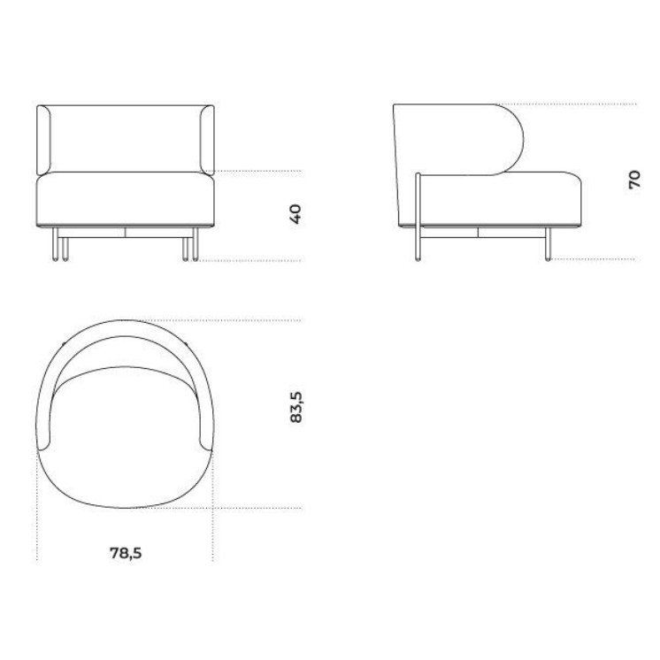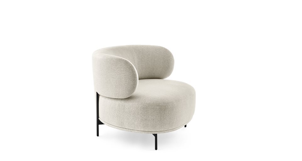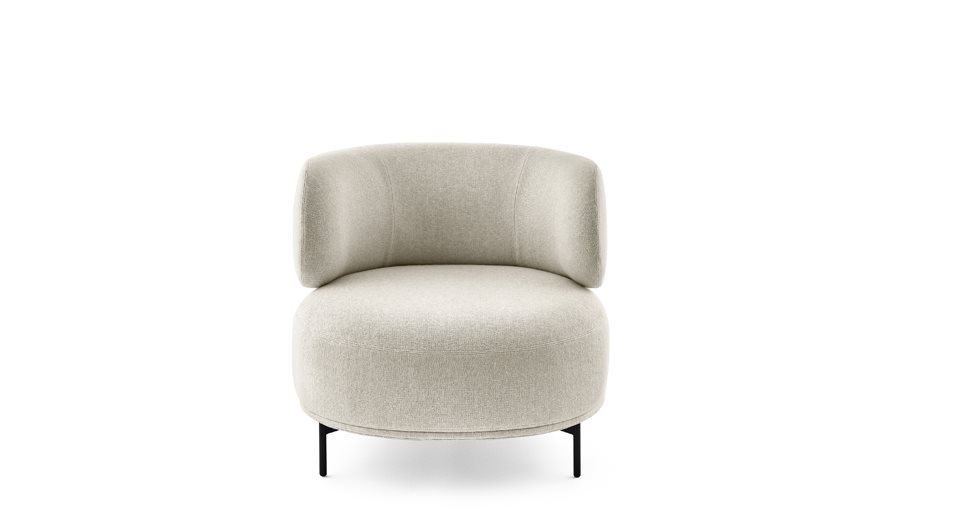 Poltrona con struttura interna in metallo imbottita con schiuma poliuretanica a densità differenziate e fibra poliestere. Basamento in metallo verniciato color “warm grey”. Rivestimento sfoderabile in tessuto o pelle nei colori del campionario.