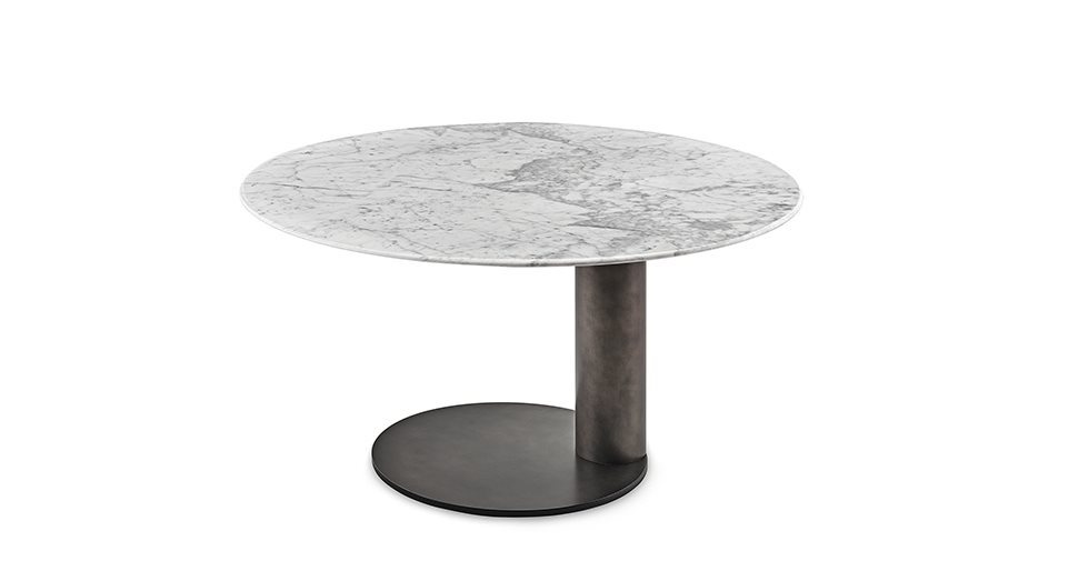 Tavolo con piano in marmo 20mm Bianco Carrara Gioia lucido naturale e struttura in metallo verniciato bronzo antico. Disponibile versione con piano in marmo 20mm Nero Marquinia levigato opaco e struttura in metallo verniciato piombo.