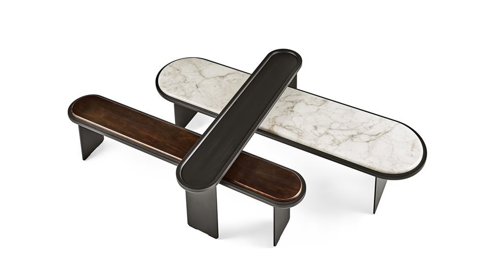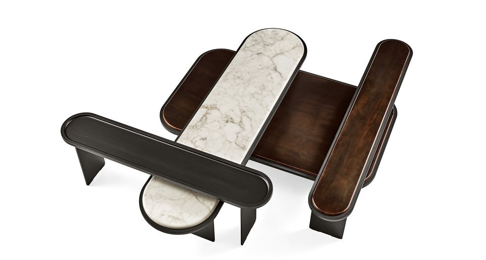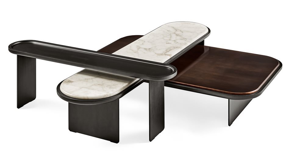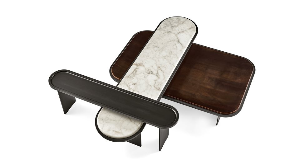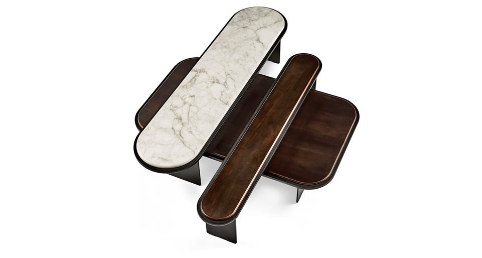 In appoggio sul top in legno, piano in cristallo 12mm molato a mezzo toro nella finitura esclusiva “Rosso Marte”. Disponibile anche piano in marmo 20mm Calacatta Vagli Oro lucido naturale oppure Ceppo di Gré spazzolato. Il tavolino “A” viene realizzato esclusivamente con piano in legno ribassato.