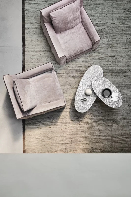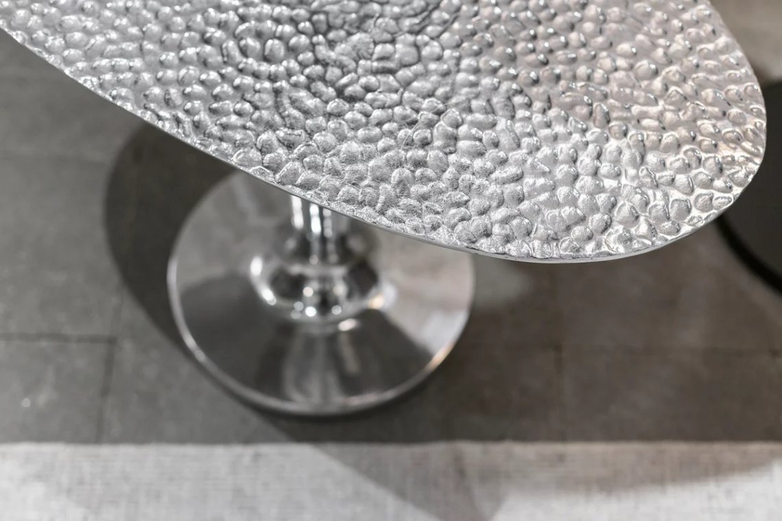 Giochi di luce e di riflessi caratterizzano la famiglia di tavolini Next 147/148. Realizzati interamente in fusione di alluminio lucidato, in diverse dimensioni e altezze, sono caratterizzate da una singola base centrale che si unisce ad un piano ovale impreziosito e decorato da un effetto martellato. La lucidità della superfice permette alla luce ci creare effetti ogni volta diversi.