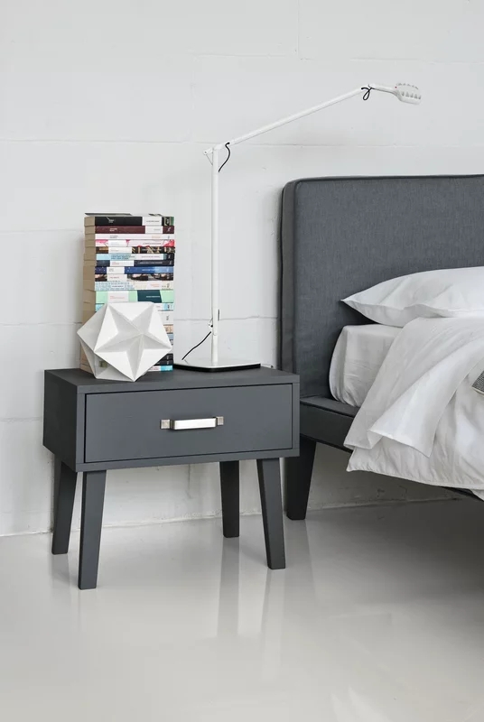 Comodino in noce Canaletto con un cassetto, maniglia in acciaio satinato. è realizzato in legno massello di noce naturale, nero, bianco, grigio, oceano o tortora ed è adatto per riempire gli spazi accanto al letto, un contenitore dai volumi compatti in cui riporre oggetti di vario genere.