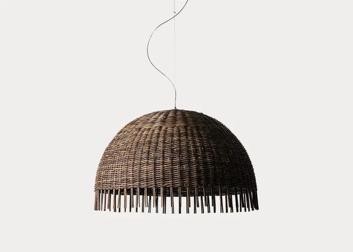 Lampada a sospensione, in crocodile rattan intrecciato, potenza max. F applicabile 20 W, 220 Volt, attacco E 27 lampadina non fornita (lunghezza cavo elettrico 200 cm; lunghezza cavo in acciaio 200 cm).