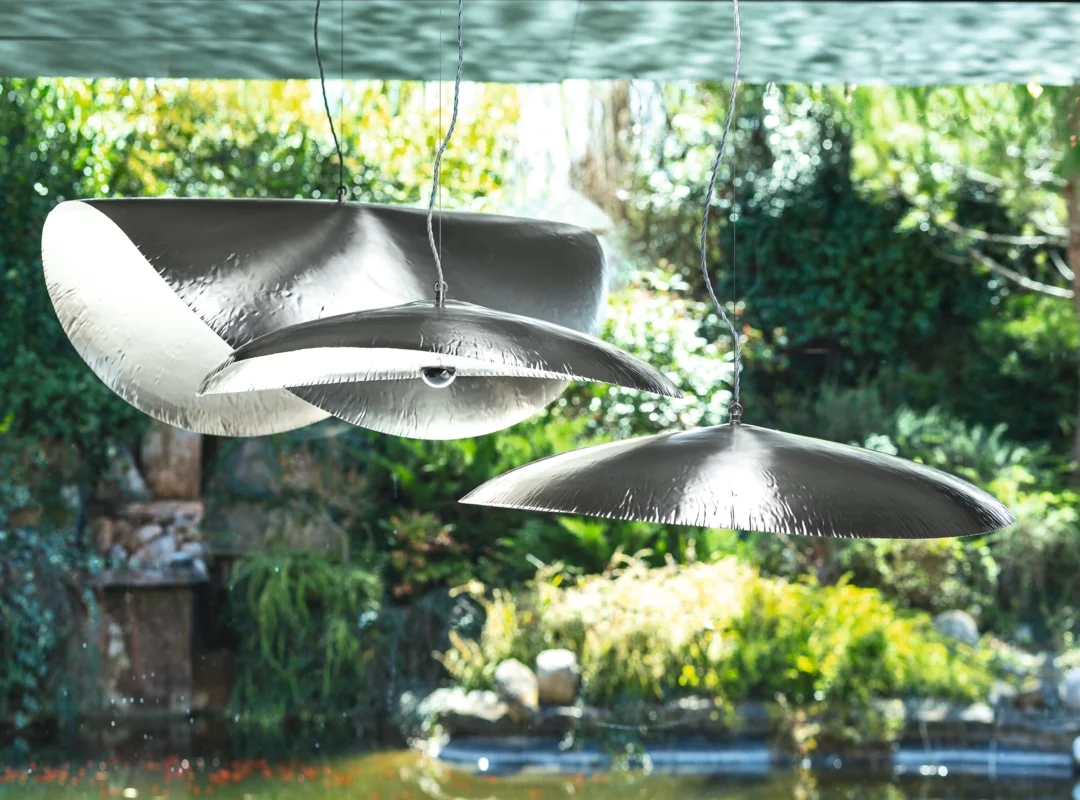 Una famiglia di lampade a sospensione dal linguaggio raffinato e contemporaneo, realizzate a partire da un disco di lamina sottile in ottone finitura nichelato dai riflessi lunari, disponibile con curvatura delicata nella versione più piccola o molto accentuata in quella più grande. Grazie al suo disegno leggero sembra fluttuare nell’aria avvolgendo delicatamente la sorgente luminosa. Possono essere utilizzate singolarmente o abbinate tra di loro per un effetto ancora più suggestivo e scenografico.