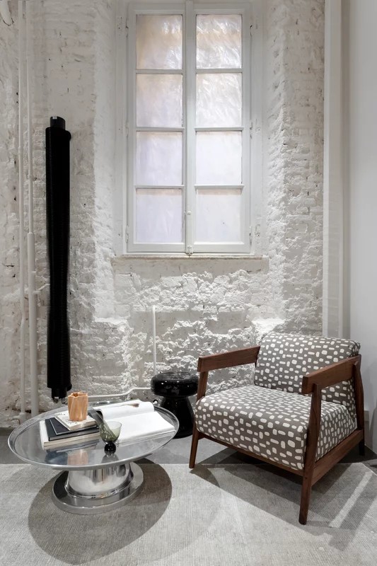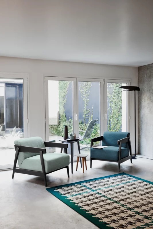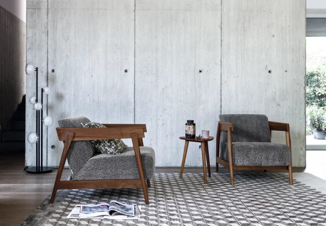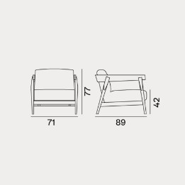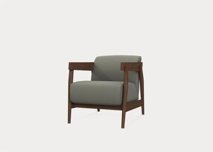 Poltrona con struttura in legno massello di noce Canaletto naturale, rovere sbiancato o rovere laccato bianco, grigio, nero, oceano o tortora, Brick 305 ha la seduta e lo schienale ammorbiditi da un unico importante cuscino imbottito in poliuretano espanso dal rivestimento sfoderabile. I diversi elementi in legno che compongono la struttura sono evidenti, inclinati e sovrapposti.