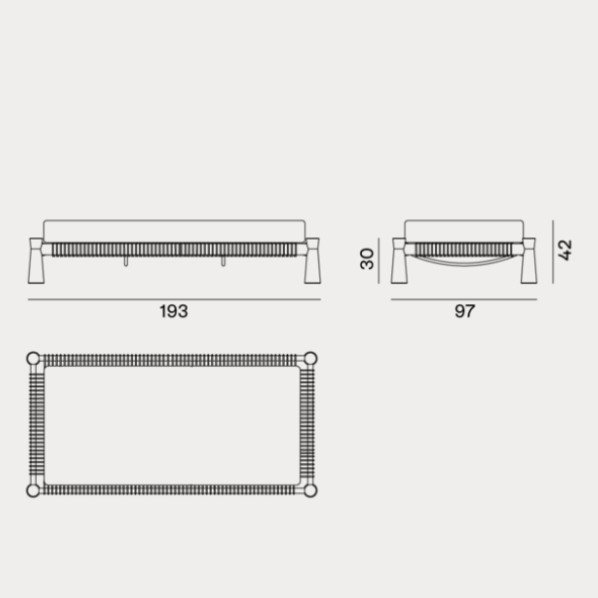 Tradizionale lettino indiano dalle proporzioni basse e ampie, il charpoy viene reinterpretato da Chiara Andreatti attraverso l’utilizzo di corde nautiche color Natural, Red e Blue, intrecciate manualmente alla struttura in legno di Iroko trattato per outdoor, caratterizzata dal particolare disegno svasato delle gambe, su cui poggiano cuscini di seduta. Disponibile in due misure 195x95 e 120x100 per movimentare lo spazio.