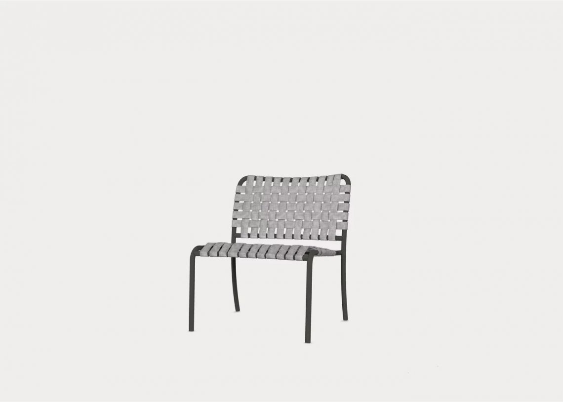 Inout 825 si sviluppa attorno ad una leggera struttura in tubolare di alluminio verniciato goffrato Pealr, Oxido, Agate o Slate, materiale ecologico ed unico per qualità tecniche. A questo si aggiunge un particolare intreccio in cinghia elastica grigia, nera, blu o tabacco, un prodotto innovativo a base di gomma sintetica e propilene.