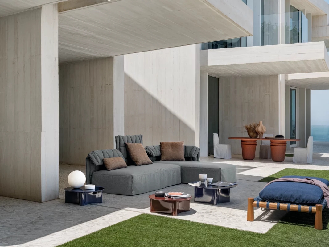 divano componibile outdoor Flair si caratterizza per lo schienale con doppia cerniera ribaltabile manualmente, indipendente per ogni singolo posto e rivestito con un tessuto trapuntato outdoor con dettaglio cucitura taglia e cuci tono su tono o a contrasto. è questo particolare a definire e movimentare lo skyline del prodotto, permettendo di avere doppie altezze sui singoli schienali. La struttura del divano in acciaio trattato per esterni si combina alla morbidezza dei cuscini di seduta in poliuretano espanso a densità variabile e fibre poliestere, rivestiti con telina poliestere outdoor e fondo traspirante antiscivolo.