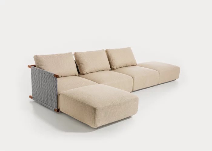 La particolarità di Hashi risiede nell’utilizzo del tessuto tecnico Jaquard Outdoor Accardi che avvolge e fascia inferiormente e superiormente gli elementi in legno iroko. Tessuto sostenibile, leggero ed impermeabile e lavorato attentamente da artigiani tessitori, il tessuto Outdoor Accardi crea un disegno tramato che si sposa armonicamente con la struttura in legno con sezione irregolare, evidenziando ancora una volta il rimando al giapponesismo e alla tradizione artigianale locale.