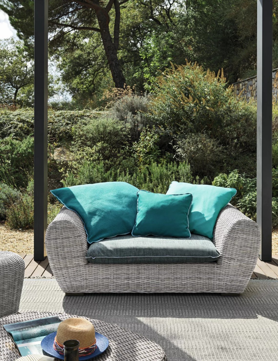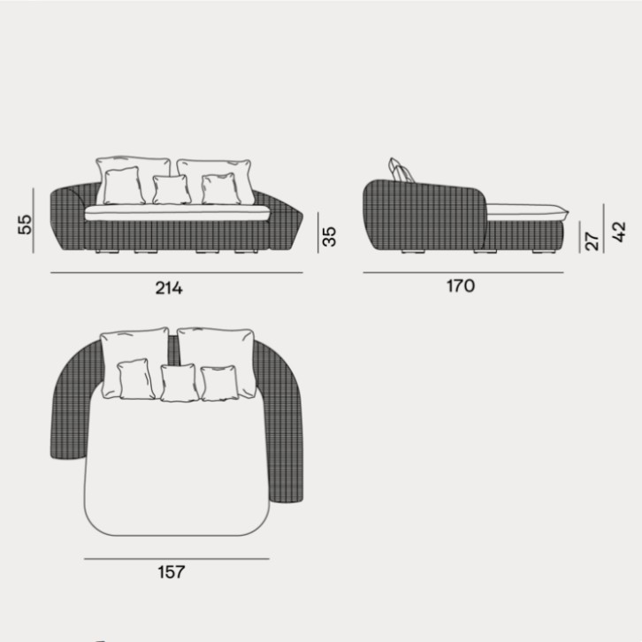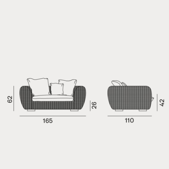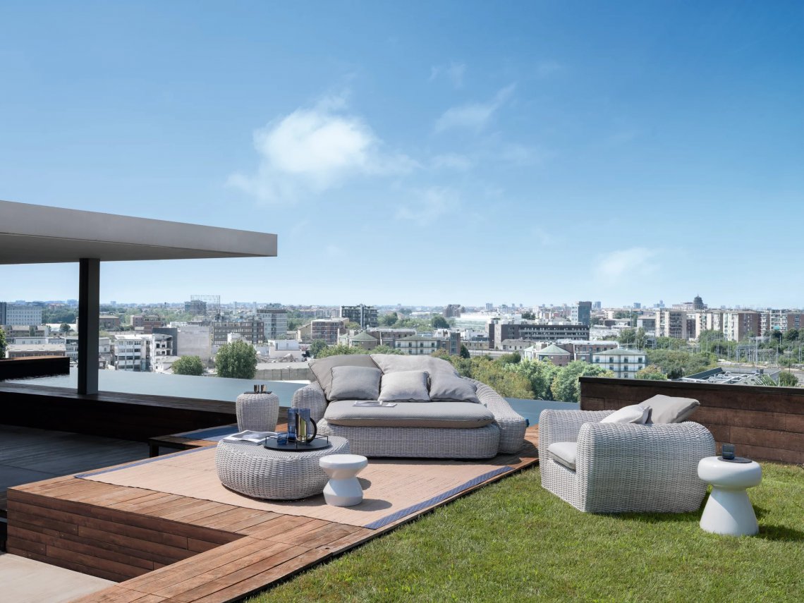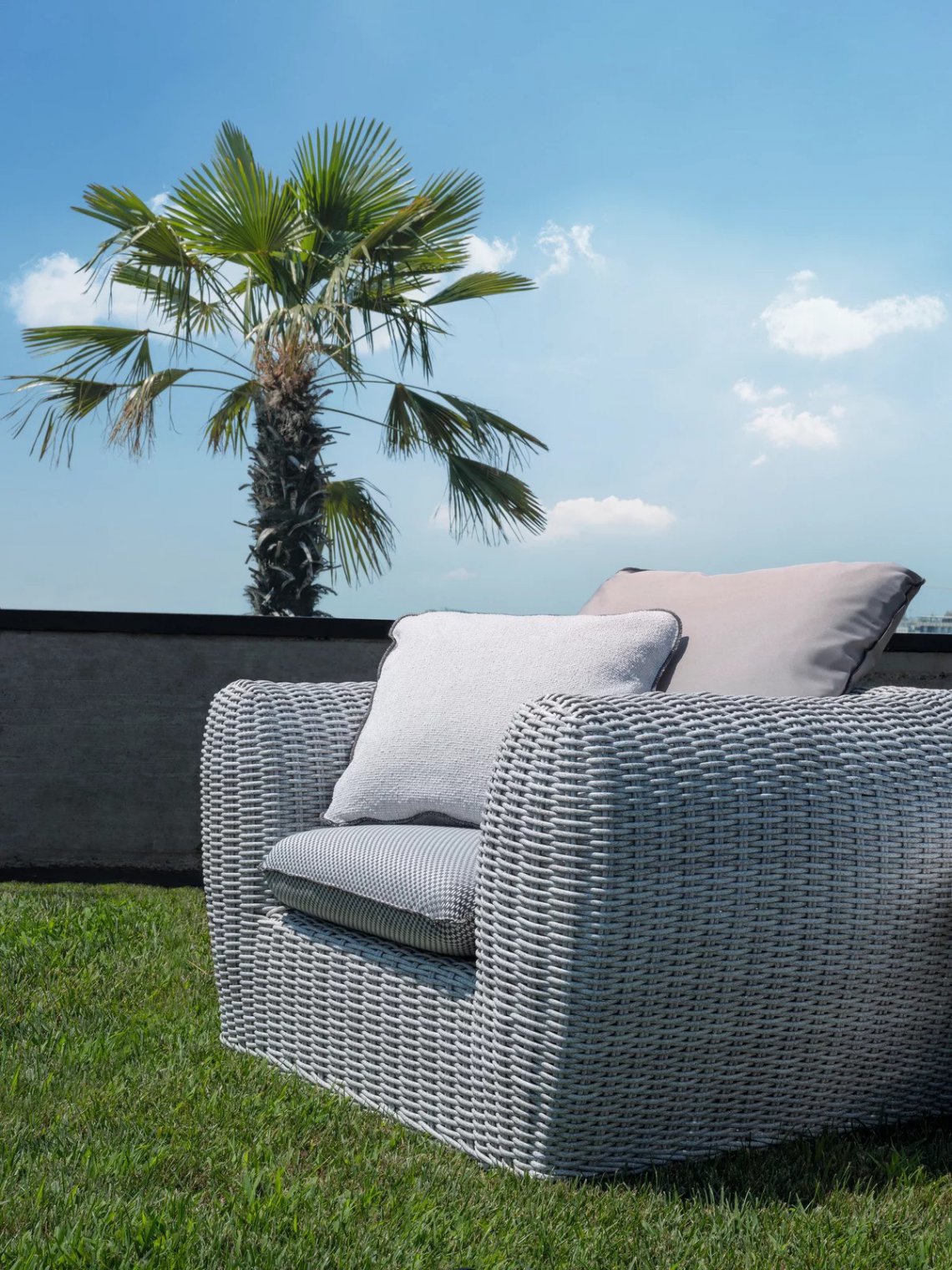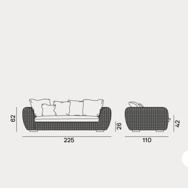 Forme morbide ed accoglienti e volumi consistenti caratterizzano la famiglia di divani Panda 01/02/03/04, disponibili in diverse dimensioni e profondità. Sono formati da una struttura e piedini in alluminio ed intreccio in fibra sintetica di polietilene Panda Resin bianco/grigio. Fibre sintetiche di ultima generazione pensate per resistere all’acqua e alla luce e per mantenere nel tempo le qualità tecniche e cromatiche, mantengono un aspetto molto naturale e durevole. Le sedute e gli schienali sono arricchiti da cuscini oversize sfoderabili per un comfort accentuato.