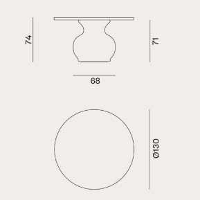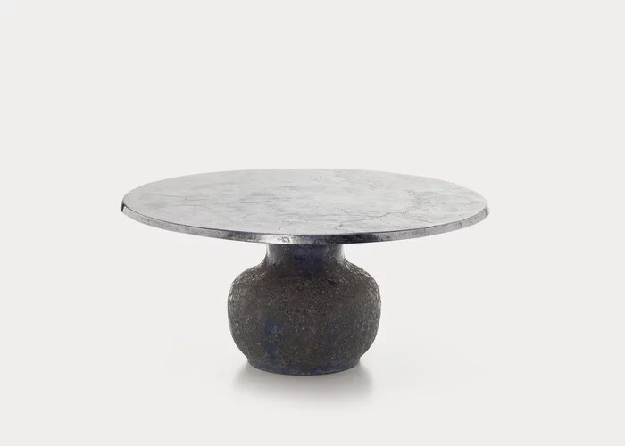 Un’audace combinazione di materiali contraddistingue la famiglia di tavoli Moon 34-36: la base in ceramica blu a forma di anfora, caratterizzata da una superficie materica irregolare ottenuta con una particolare finitura a mano, è abbinata ad un top rotondo, realizzato in fusione di alluminio o marmo bianco di Carrara.