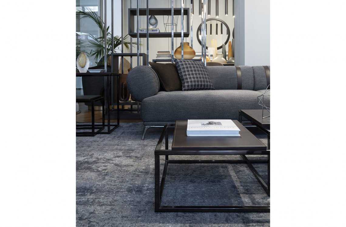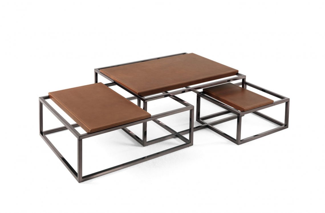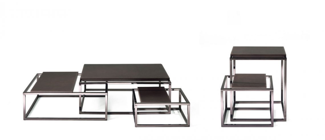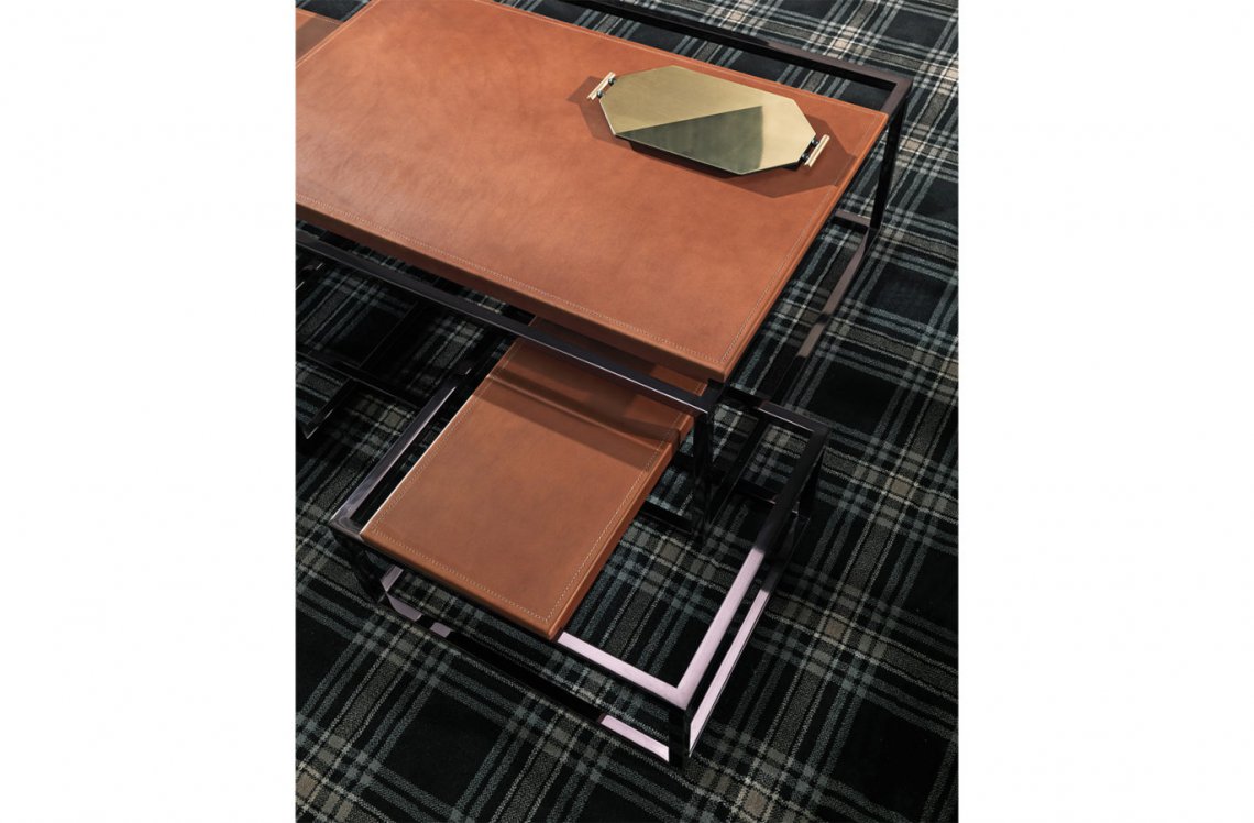 A scenographic table with a strong visual impact. A contemporary design language, based on lightness and essentiality, turns into a complex play of geometric elements, with different heights and dimensions. Evolution of the Matrix bookcase, the table features a black chrome finishing and adjustable shelves covered in saddle leather with stitching on borders, according with the new mood permeating the collection.