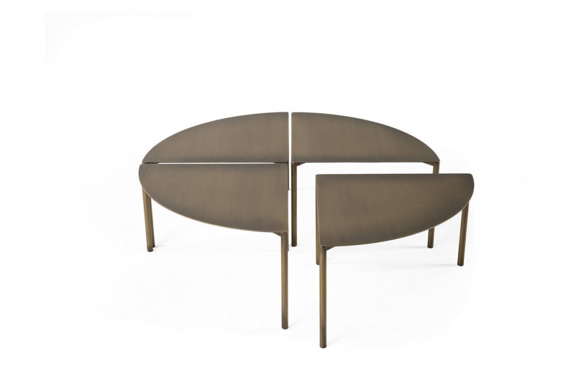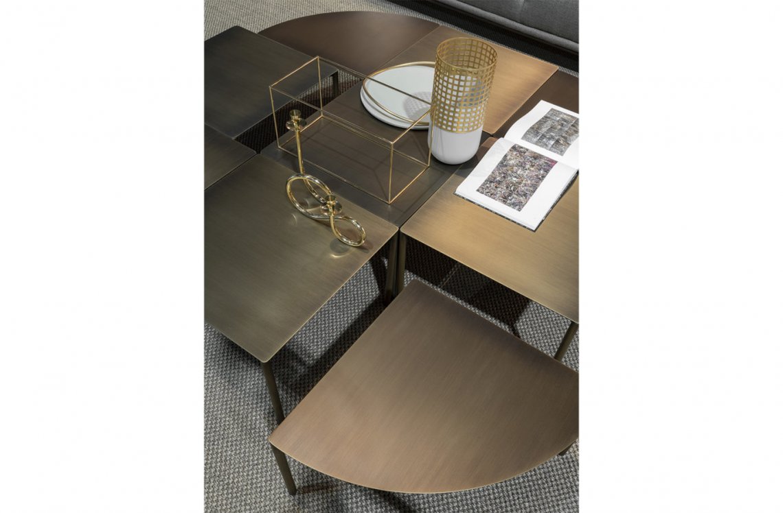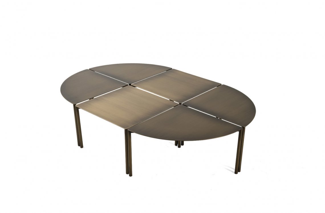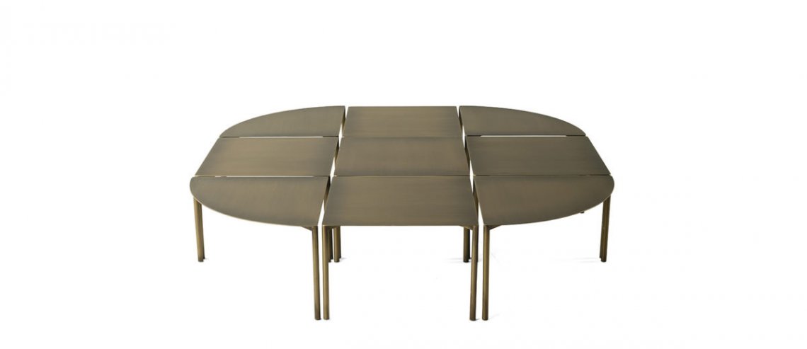 Modularity, essentiality and dynamism for the Times Square table. Consisting of nine combined elements, the table creates a game of fluid and harmonious shapes.