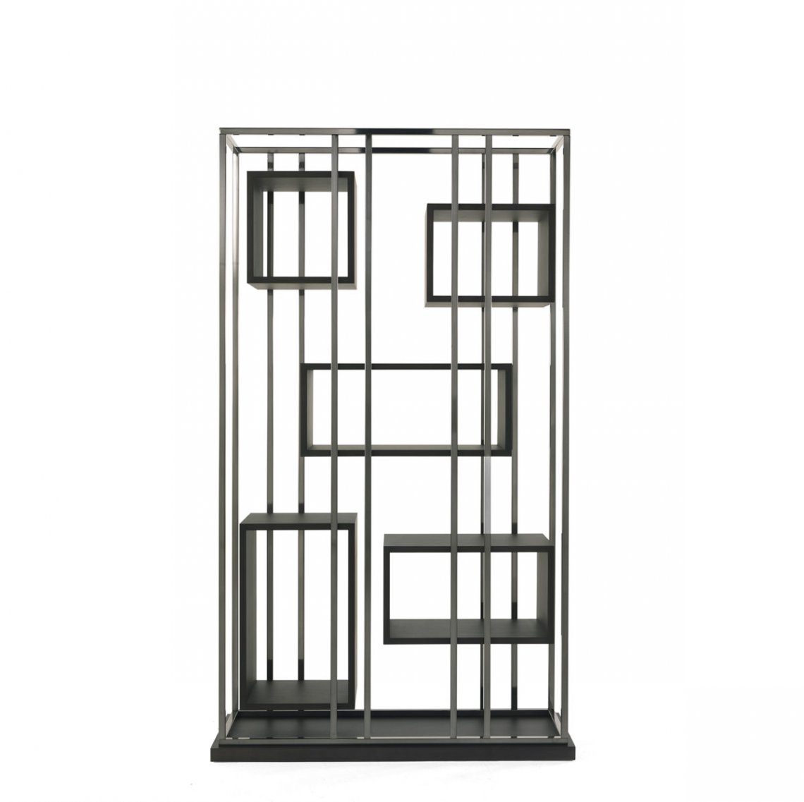 Geometries and chromatic games distinguish the iconic Mackintosh double-sided bookcase, a contemporary piece of furniture with decorative allure, worthy of a starring role in any living space. Proposed in a new version that combines the black chrome of the structure with the smoky grey Tay wood of the cubes, the bookcase characterizes the setting with its bold charm.
