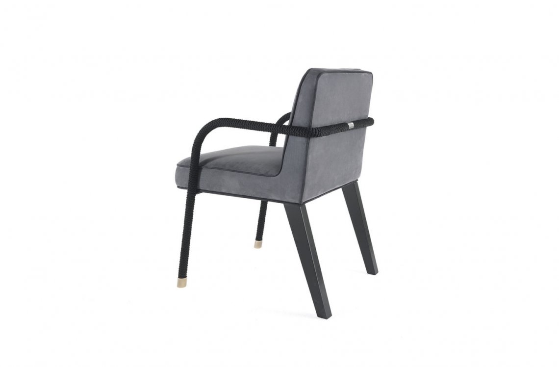 Linear and essential shapes for an chair in Gianfranco Ferré Home style. Loop is inspired by the 50s style. The rope is the element that enriches the armchair covering the structure and becoming leg and armrest. Other featuring elements are the brass caps of the legs and the leather with soft colors.