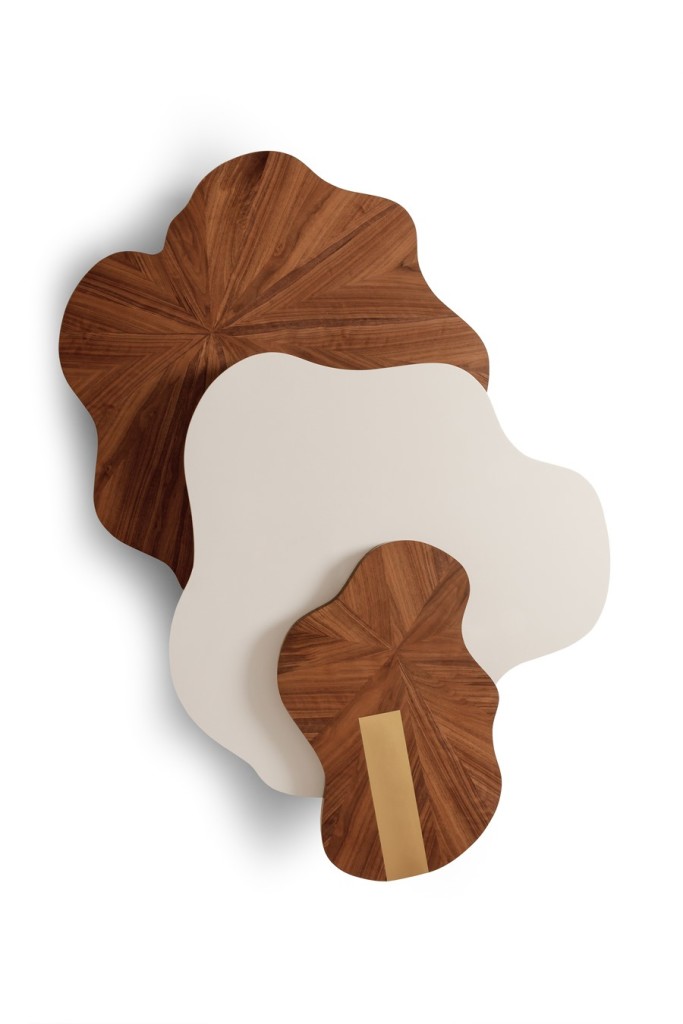 The Nenuphar gently floats on the surface with different cascading tops that create a charming chromatic effect. The brass and crystal acrylic feet maintain the floating illusion, while providing a playful contrast with the inlay marquetry technique and lacquered top.