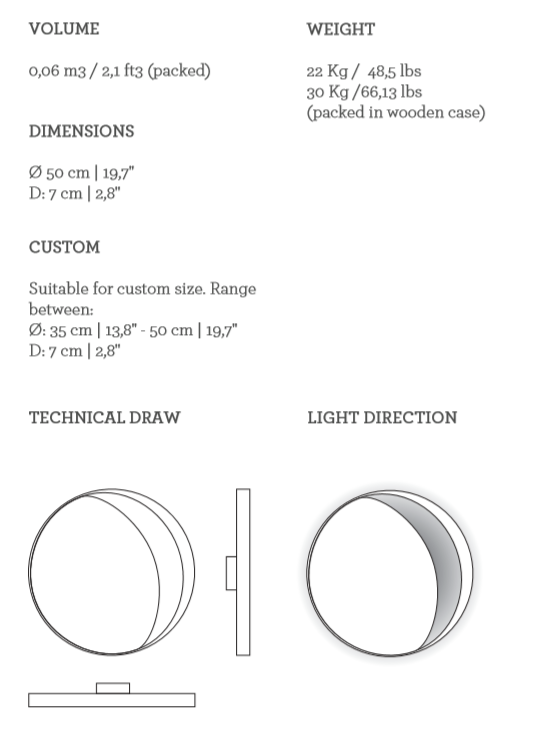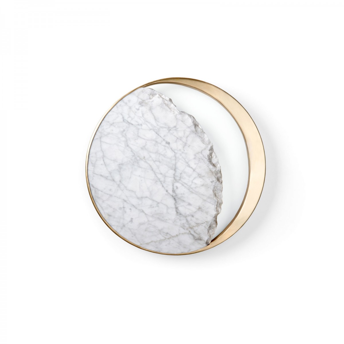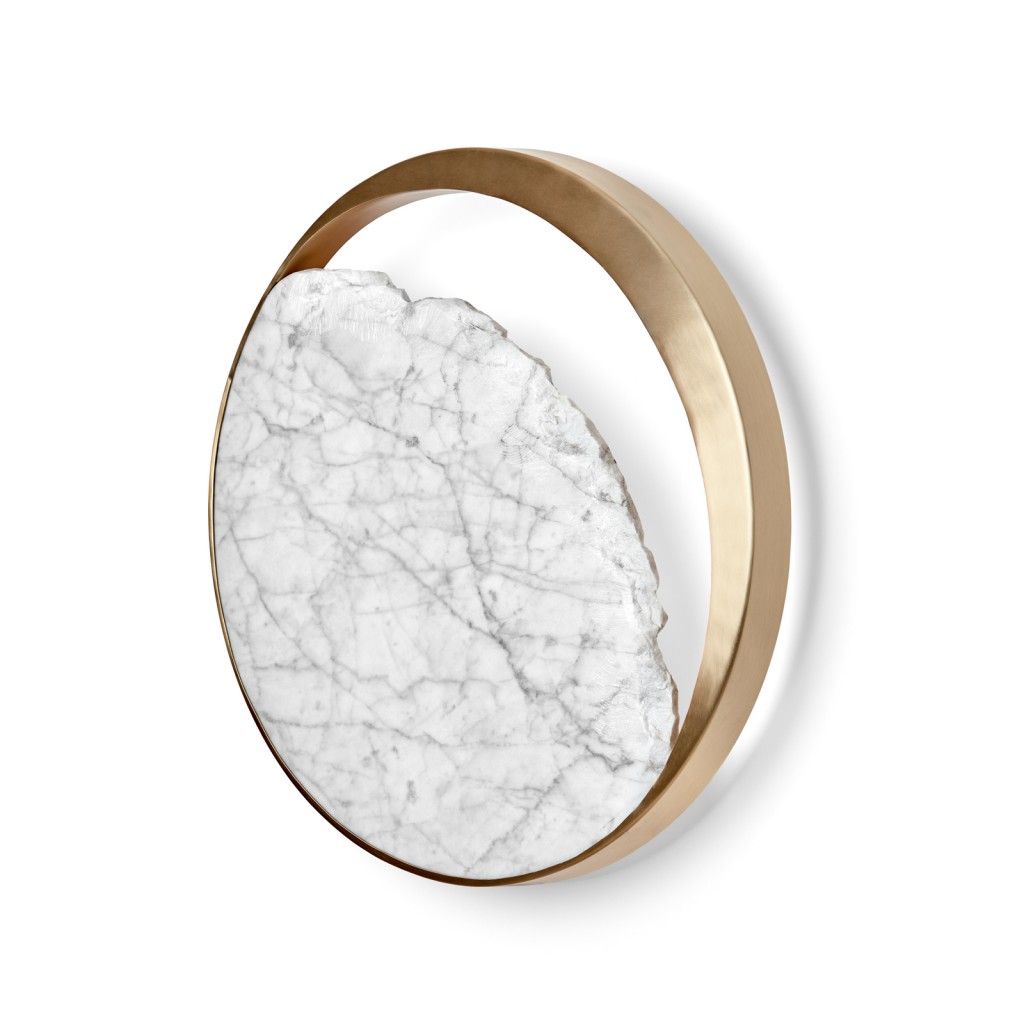 The Eclipse Wall Lamp provokes an intersection between light and shadow, stone and metal. When a third element comes into alignment, the subject, it’s demi-lunar light core and the metal rim that envelops the shape creates a stellar coronal light diffusion. The unique and sculptural hand-carved marble shade and hand-molded metal rim create a sense of invisible and harmonious movement.