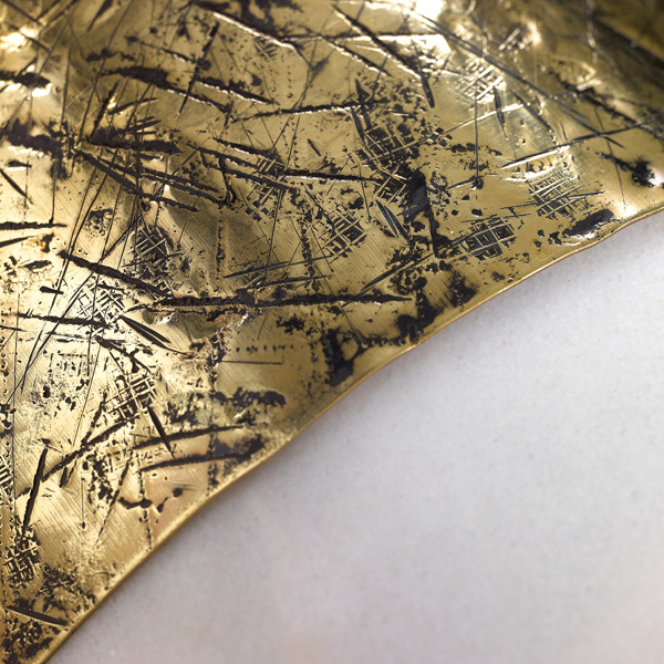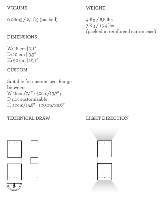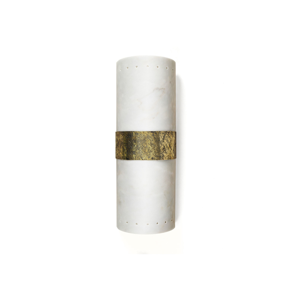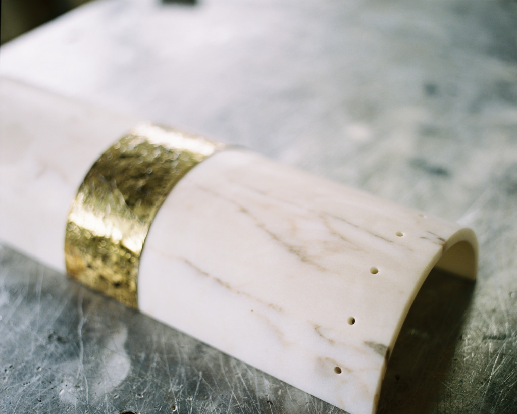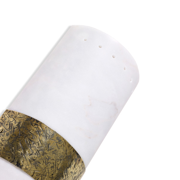 The unique veins of the marble are complemented by the soft backlight that comes from behind the hand hammered metal plate at the center of the Estremoz.
