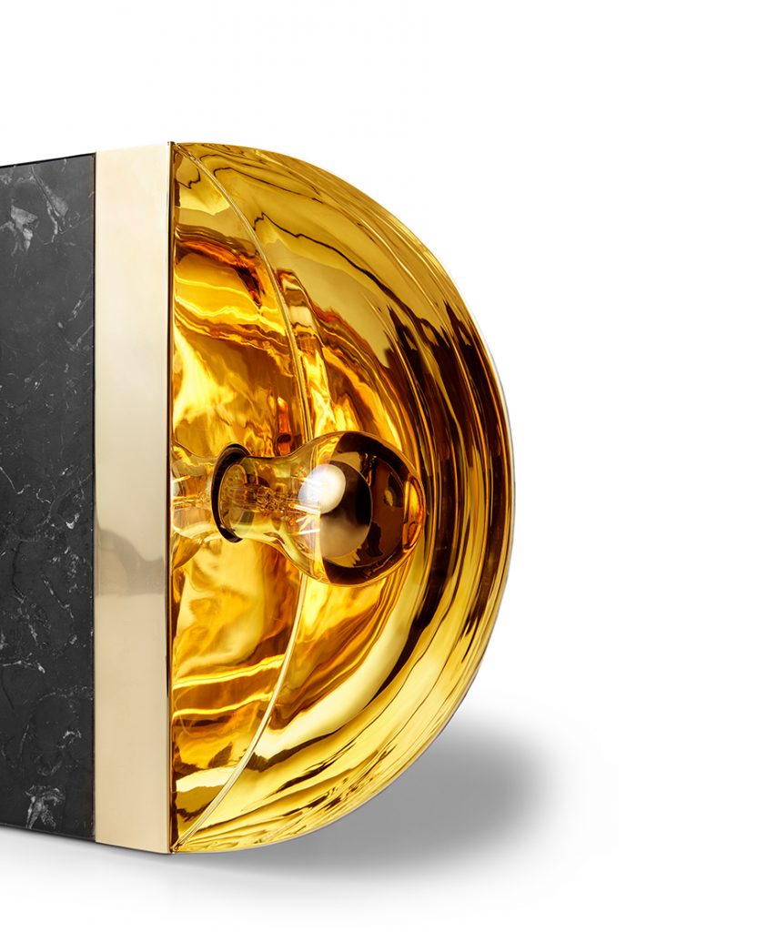 Hemisphere draws on the dominant role played by the sphere in our universe against the infinite nature of an ordered cosmos. The principal yellow gold plated brass quarter-sphere is juxtaposed against a rectangular Carrara or Negro Marquina marble block, creating a startling contrast between boldness and serenity, light and shadow, straight and curved reflections.